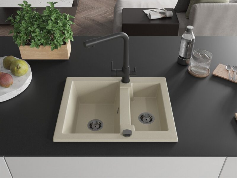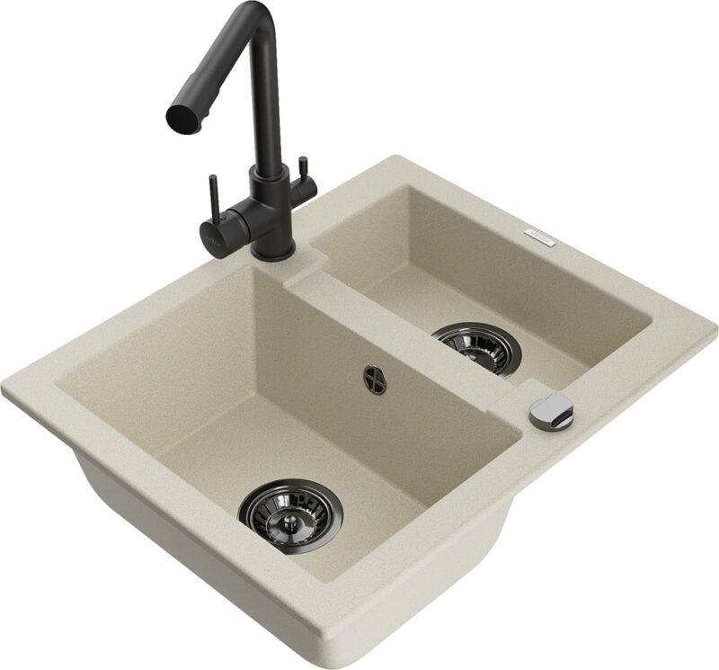 Technické dáta: Drez: Rozmer: 582x475x177 mm Hĺbka komory: 162 mm (väčšia), 102 mm (menšia) Rozmery komory: 395×272 mm (väčšie), 375×182 mm (menšie) Priemer odtoku: ø90 mm Typ: 1,5-komorový Typ: Zapustené do pracovnej dosky Farba béžová Povrchová úprava sifónu: čierna Materiál: žula (80% žulové kamenivo 20% živice) Prepadový otvor: Áno Otvory: (batérie, automat) 2 Vysoká odolnosť proti poškriabaniu a zmene farby Odolnosť proti tepelným šokom Povrch pre ľahké čistenie Jeden dodatočný vyfrézovaný otvor na samodierovanie ø35 Kuchynská batéria: Materiál: mosadz Čierna farba Hlava: Keramická Perlátor: Áno Typ: Dve rukoväte Rozsah výtoku: 235 mm Výška batérie: 315 mm Dvojhlavá batéria s prídavným filtrom na pitnú vodu(GT) Ean: 5905315026880