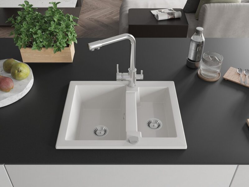 Technické dáta: drez: Rozmer: 582 x 475 x 177 mm Hĺbka komory: 162 mm (väčšia), 102 mm (menšia) Rozmery komory: 395×272 mm (väčšie), 375×182 mm (menšie) Priemer odtoku: ø90 mm Typ: 1,5 komory Typ: Zapustené do pracovnej dosky biela farba Povrchová úprava sifónu: Chrome Materiál: žula (80% žulové kamenivo, 20% živice) Prepadový otvor: Áno Otvory: (batérie, automatické) 2 Vysoká odolnosť proti poškriabaniu a zmene farby Odolnosť proti tepelným šokom Ľahko čistiteľný povrch Jeden dodatočný vyfrézovaný otvor na samodierovanie ø35 kuchynská batéria: Materiál: mosadz Farba: Chrome Hlava: Keramická Prevzdušňovač: Áno Typ: Dve rukoväte Rozsah výtoku: 235 mm Výška batérie: 315 mm Dvojhlavá batéria s prídavným filtrom na pitnú vodu(GT) Ean: 5905315026811