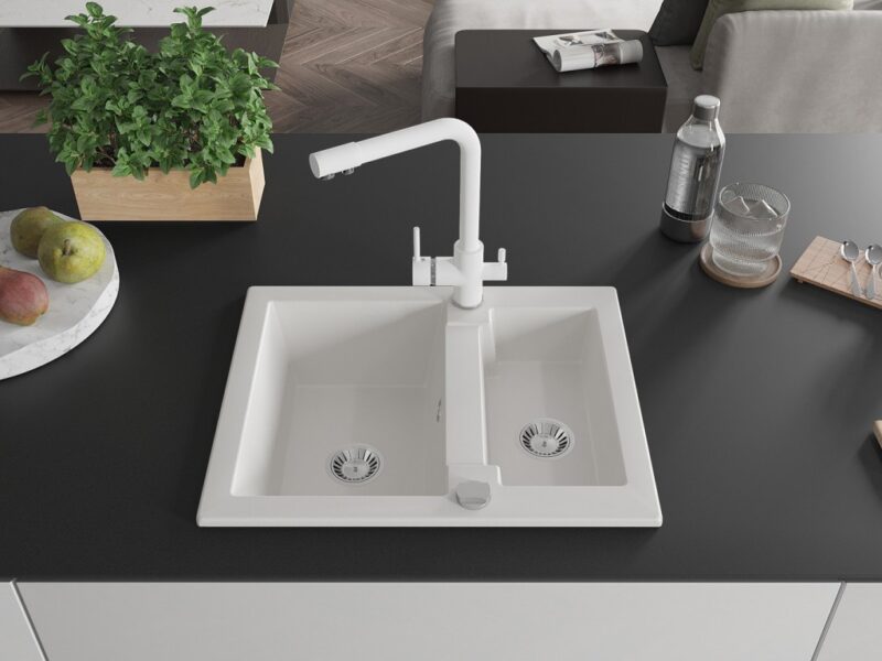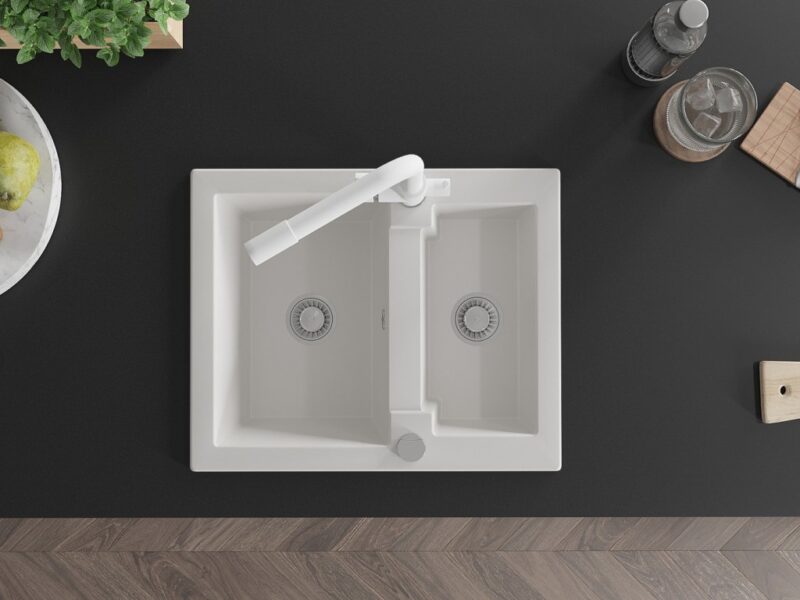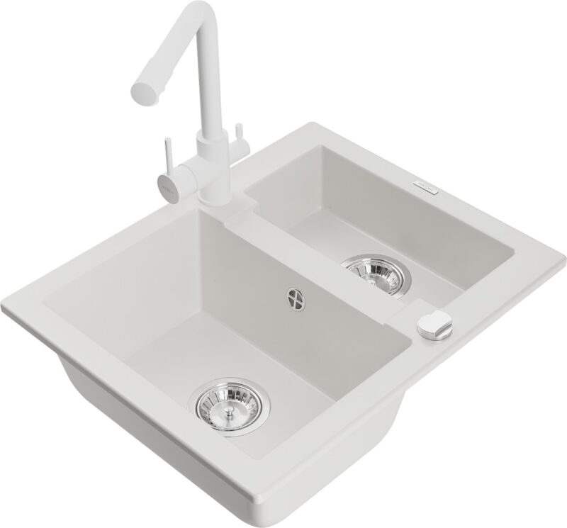 Technické dáta: drez: Rozmer: 582 x 475 x 177 mm Hĺbka komory: 162 mm (väčšia), 102 mm (menšia) Rozmery komory: 395×272 mm (väčšie), 375×182 mm (menšie) Priemer odtoku: ø90 mm Typ: 1,5 komory Typ: Zapustené do pracovnej dosky biela farba Povrchová úprava sifónu: Chrome Materiál: žula (80% žulové kamenivo, 20% živice) Prepadový otvor: Áno Otvory: (batérie, automatické) 2 Vysoká odolnosť proti poškriabaniu a zmene farby Odolnosť proti tepelným šokom Ľahko čistiteľný povrch Jeden dodatočný vyfrézovaný otvor na samodierovanie ø35 kuchynská batéria: Materiál: mosadz biela farba Hlava: Keramická Prevzdušňovač: Áno Typ: Dve rukoväte Rozsah výtoku: 235 mm Výška batérie: 315 mm Dvojhlavá batéria s prídavným filtrom na pitnú vodu(GT) Ean: 5905315026828