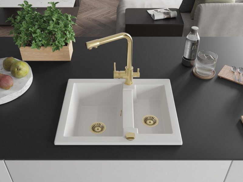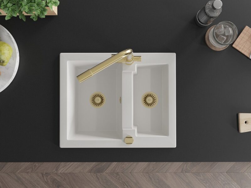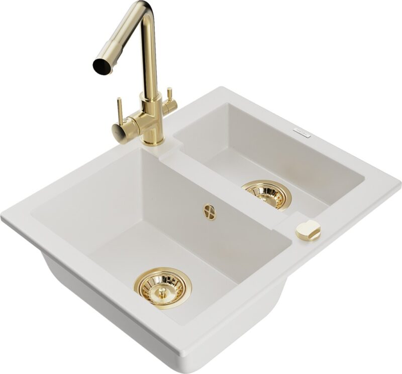 Technické dáta: drez: Rozmer: 582 x 475 x 177 mm Hĺbka komory: 162 mm (väčšia), 102 mm (menšia) Rozmery komory: 395×272 mm (väčšie), 375×182 mm (menšie) Priemer odtoku: ø90 mm Typ: 1,5 komory Typ: Zapustené do pracovnej dosky biela farba Povrchová úprava sifónu: zlatá Materiál: žula (80% žulové kamenivo, 20% živice) Prepadový otvor: Áno Otvory: (batérie, automatické) 2 Vysoká odolnosť proti poškriabaniu a zmene farby Odolnosť proti tepelným šokom Ľahko čistiteľný povrch Jeden dodatočný vyfrézovaný otvor na samodierovanie ø35 kuchynská batéria: Materiál: mosadz Farba: Zlatá Hlava: Keramická Prevzdušňovač: Áno Typ: Dve rukoväte Rozsah výtoku: 235 mm Výška batérie: 315 mm Dvojhlavá batéria s prídavným filtrom na pitnú vodu(GT) Ean: 5905315026835