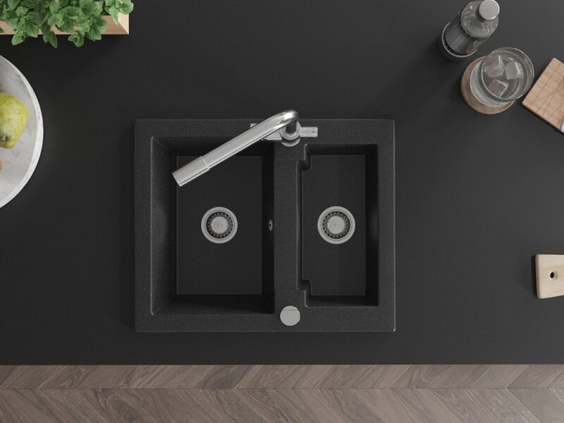 Technické dáta: Drez: Rozmer: 582x475x177 mm Hĺbka komory: 162 mm (väčšia), 102 mm (menšia) Rozmery komory: 395×272 mm (väčšie), 375×182 mm (menšie) Priemer odtoku: ø90 mm Typ: 1,5-komorový Typ: Zapustené do pracovnej dosky Farba: čierna/strieborná metalíza Povrchová úprava sifónu: Chrome Materiál: žula (80% žulové kamenivo 20% živice) Prepadový otvor: Áno Otvory: (batérie, automat) 2 Vysoká odolnosť proti poškriabaniu a zmene farby Odolnosť proti tepelným šokom Povrch pre ľahké čistenie Jeden dodatočný vyfrézovaný otvor na samodierovanie ø35 Kuchynská batéria: Materiál: mosadz Farba: Chrome Hlava: Keramická Perlátor: Áno Typ: Dve rukoväte Rozsah výtoku: 235 mm Výška batérie: 315 mm Dvojhlavá batéria s prídavným filtrom na pitnú vodu(GT) Ean: 5905315026941