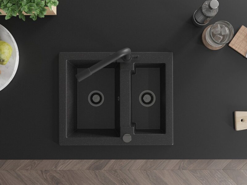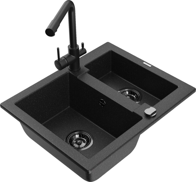 Technické dáta: Drez: Rozmer: 582x475x177 mm Hĺbka komory: 162 mm (väčšia), 102 mm (menšia) Rozmery komory: 395×272 mm (väčšie), 375×182 mm (menšie) Priemer odtoku: ø90 mm Typ: 1,5-komorový Typ: Zapustené do pracovnej dosky Farba: čierna/strieborná metalíza Povrchová úprava sifónu: čierna Materiál: žula (80% žulové kamenivo 20% živice) Prepadový otvor: Áno Otvory: (batérie, automat) 2 Vysoká odolnosť proti poškriabaniu a zmene farby Odolnosť proti tepelným šokom Povrch pre ľahké čistenie Jeden dodatočný vyfrézovaný otvor na samodierovanie ø35 Kuchynská batéria: Materiál: mosadz Čierna farba Hlava: Keramická Perlátor: Áno Typ: Dve rukoväte Rozsah výtoku: 235 mm Výška batérie: 315 mm Dvojhlavá batéria s prídavným filtrom na pitnú vodu(GT) Ean: 5905315026972