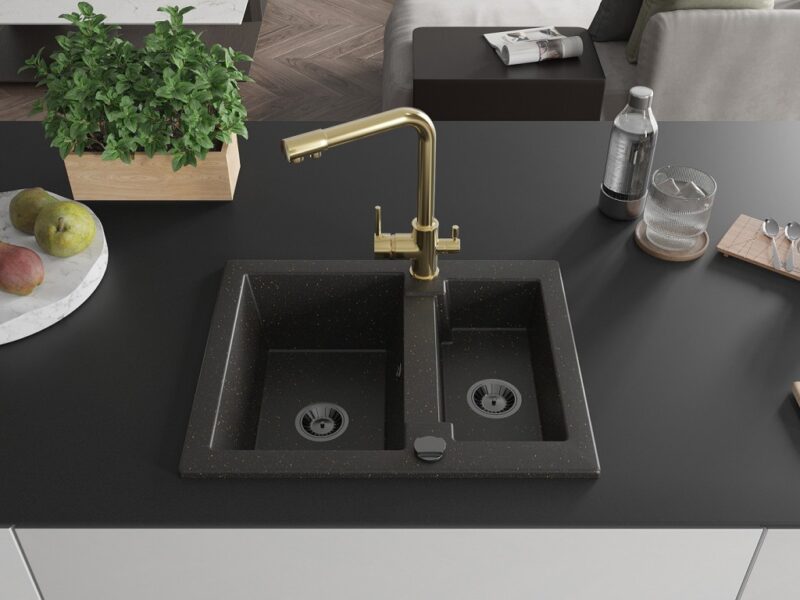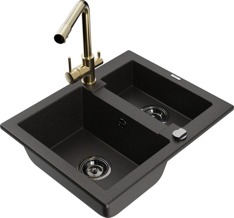 Technické dáta: Drez: Rozmer: 582x475x177 mm Hĺbka komory: 162 mm (väčšia), 102 mm (menšia) Rozmery komory: 395×272 mm (väčšie), 375×182 mm (menšie) Priemer odtoku: ø90 mm Typ: 1,5-komorový Typ: Zapustené do pracovnej dosky Farba: čierna / zlatá metalíza Povrchová úprava sifónu: čierna Materiál: žula (80% žulové kamenivo 20% živice) Prepadový otvor: Áno Otvory: (batérie, automat) 2 Vysoká odolnosť proti poškriabaniu a zmene farby Odolnosť proti tepelným šokom Povrch pre ľahké čistenie Jeden dodatočný vyfrézovaný otvor na samodierovanie ø35 Kuchynská batéria: Materiál: mosadz Farba: Zlatá Hlava: Keramická Perlátor: Áno Typ: Dve rukoväte Rozsah výtoku: 235 mm Výška batérie: 315 mm Dvojhlavá batéria s prídavným filtrom na pitnú vodu(GT) Ean: 5905315027009