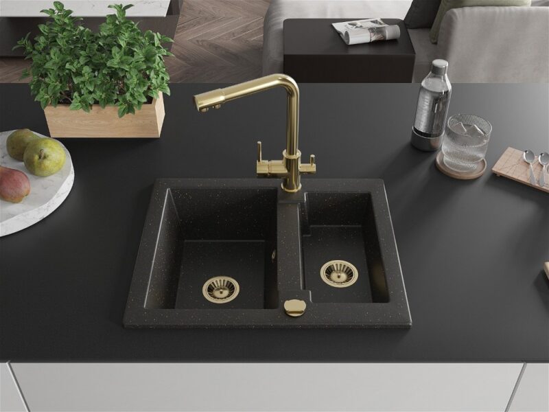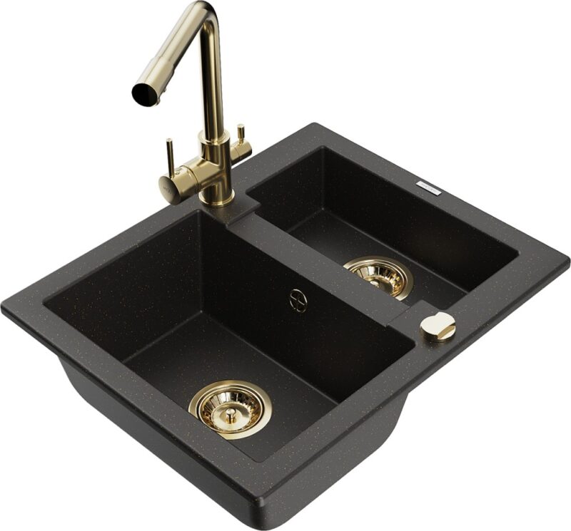 Technické dáta: Drez: Rozmer: 582x475x177 mm Hĺbka komory: 162 mm (väčšia), 102 mm (menšia) Rozmery komory: 395×272 mm (väčšie), 375×182 mm (menšie) Priemer odtoku: ø90 mm Typ: 1,5-komorový Typ: Zapustené do pracovnej dosky Farba: čierna / zlatá metalíza Povrchová úprava sifónu: zlatá Materiál: žula (80% žulové kamenivo 20% živice) Prepadový otvor: Áno Otvory: (batérie, automat) 2 Vysoká odolnosť proti poškriabaniu a zmene farby Odolnosť proti tepelným šokom Povrch pre ľahké čistenie Jeden dodatočný vyfrézovaný otvor na samodierovanie ø35 Kuchynská batéria: Materiál: mosadz Farba: Zlatá Hlava: Keramická Perlátor: Áno Typ: Dve rukoväte Rozsah výtoku: 235 mm Výška batérie: 315 mm Dvojhlavá batéria s prídavným filtrom na pitnú vodu(GT) Ean: 5905315026996
