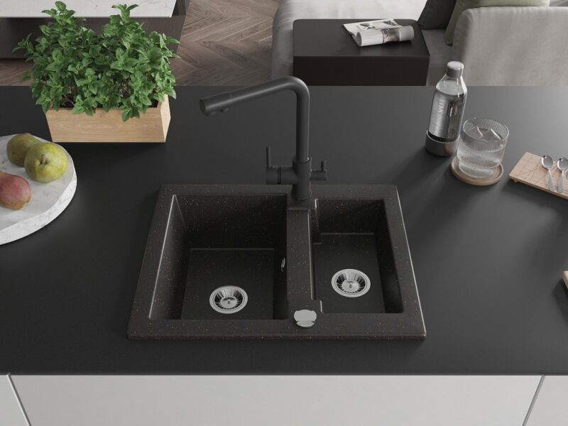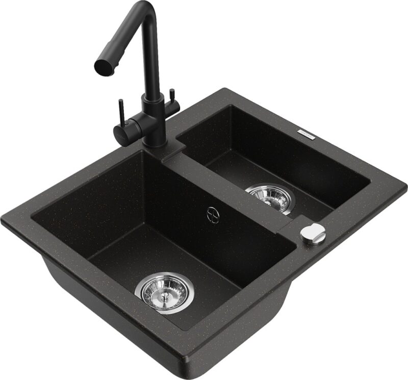 Technické dáta: Drez: Rozmer: 582x475x177 mm Hĺbka komory: 162 mm (väčšia), 102 mm (menšia) Rozmery komory: 395×272 mm (väčšie), 375×182 mm (menšie) Priemer odtoku: ø90 mm Typ: 1,5-komorový Typ: Zapustené do pracovnej dosky Farba: čierna / zlatá metalíza Povrchová úprava sifónu: Chrome Materiál: žula (80% žulové kamenivo 20% živice) Prepadový otvor: Áno Otvory: (batérie, automat) 2 Vysoká odolnosť proti poškriabaniu a zmene farby Odolnosť proti tepelným šokom Povrch pre ľahké čistenie Jeden dodatočný vyfrézovaný otvor na samodierovanie ø35 Kuchynská batéria: Materiál: mosadz Čierna farba Hlava: Keramická Perlátor: Áno Typ: Dve rukoväte Rozsah výtoku: 235 mm Výška batérie: 315 mm Dvojhlavá batéria s prídavným filtrom na pitnú vodu(GT) Ean: 5905315027016
