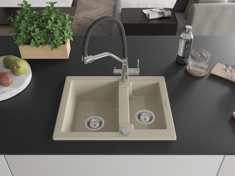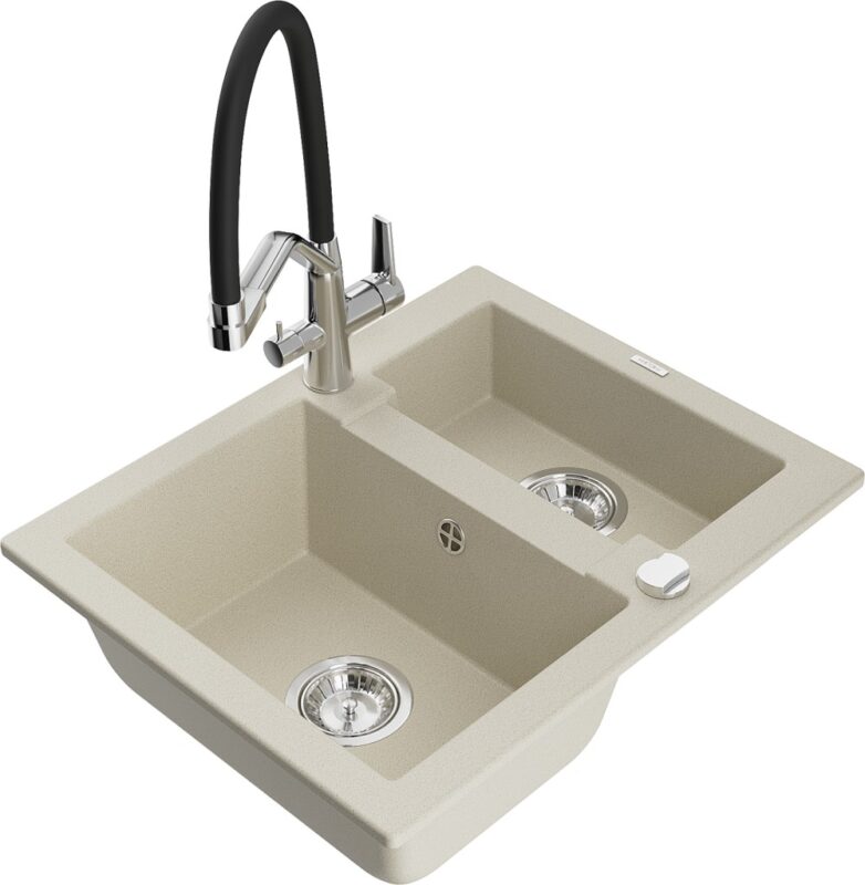 Technické dáta: Drez: Rozmer: 582x475x177 mm Hĺbka komory: 162 mm (väčšia), 102 mm (menšia) Rozmery komory: 395×272 mm (väčšie), 375×182 mm (menšie) Priemer odtoku: ø90 mm Typ: 1,5-komorový Typ: Zapustené do pracovnej dosky Farba béžová Povrchová úprava sifónu: Chrome Materiál: žula (80% žulové kamenivo 20% živice) Prepadový otvor: Áno Otvory: (batérie, automat) 2 Vysoká odolnosť proti poškriabaniu a zmene farby Odolnosť proti tepelným šokom Povrch pre ľahké čistenie Kuchynská batéria: Materiál: mosadz Farba: chróm/čierna Hlavy: Keramické Perlátor: Áno Typ výtoku: Flexibilný s mosadznou podperou Rozsah výtoku: 260 mm Výška: 405 mm Typ: Dve rukoväte Dvojhlavá batéria s prídavným filtrom na pitnú vodu(GT) Ean: 5905315055606