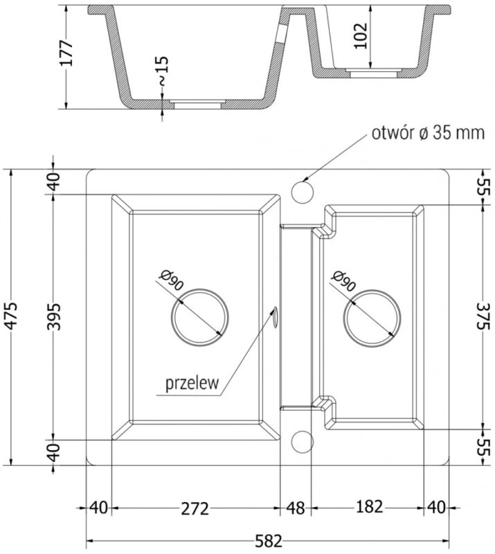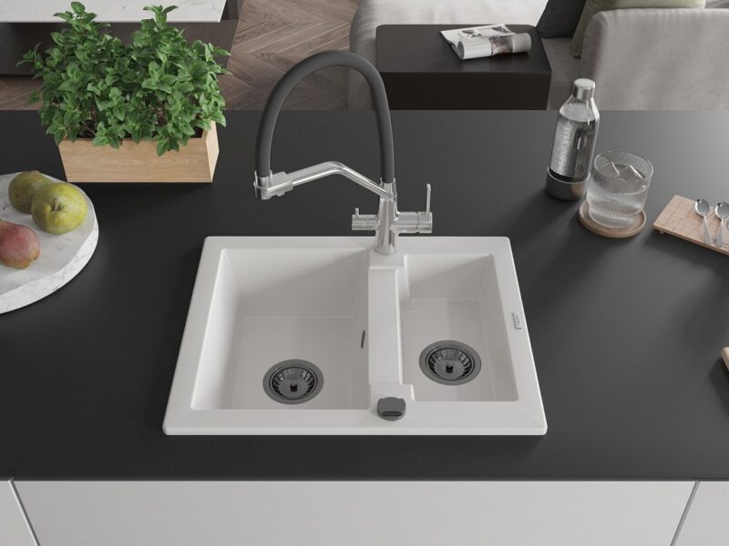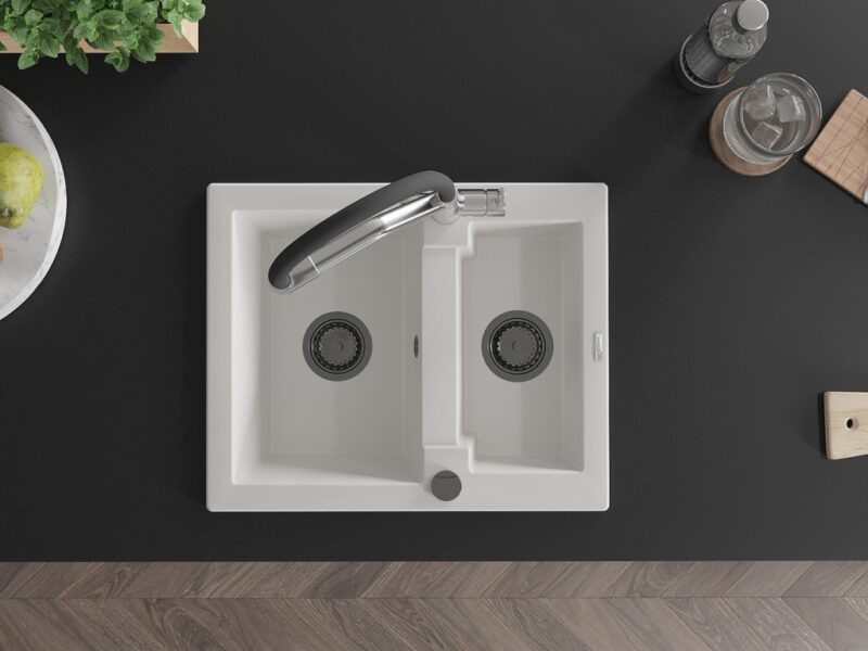Technické dáta: drez: Rozmer: 582 x 475 x 177 mm Hĺbka komory: 162 mm (väčšia), 102 mm (menšia) Rozmery komory: 395×272 mm (väčšie), 375×182 mm (menšie) Priemer odtoku: ø90 mm Typ: 1,5 komory Typ: Zapustené do pracovnej dosky biela farba Povrchová úprava sifónu: čierna Materiál: žula (80% žulové kamenivo, 20% živice) Prepadový otvor: Áno Otvory: (batérie, automatické) 2 Vysoká odolnosť proti poškriabaniu a zmene farby Odolnosť proti tepelným šokom Ľahko čistiteľný povrch kuchynská batéria: Materiál: mosadz Farba: chróm/čierna Hlavy: Keramické Prevzdušňovač: Áno Typ hubica: Flexibilný s mosadzným držiakom Rozsah výtoku: 260 mm Výška: 405 mm Typ: Dve rukoväte Dvojhlavá batéria s prídavným filtrom na pitnú vodu(GT) Ean: 5905315055552