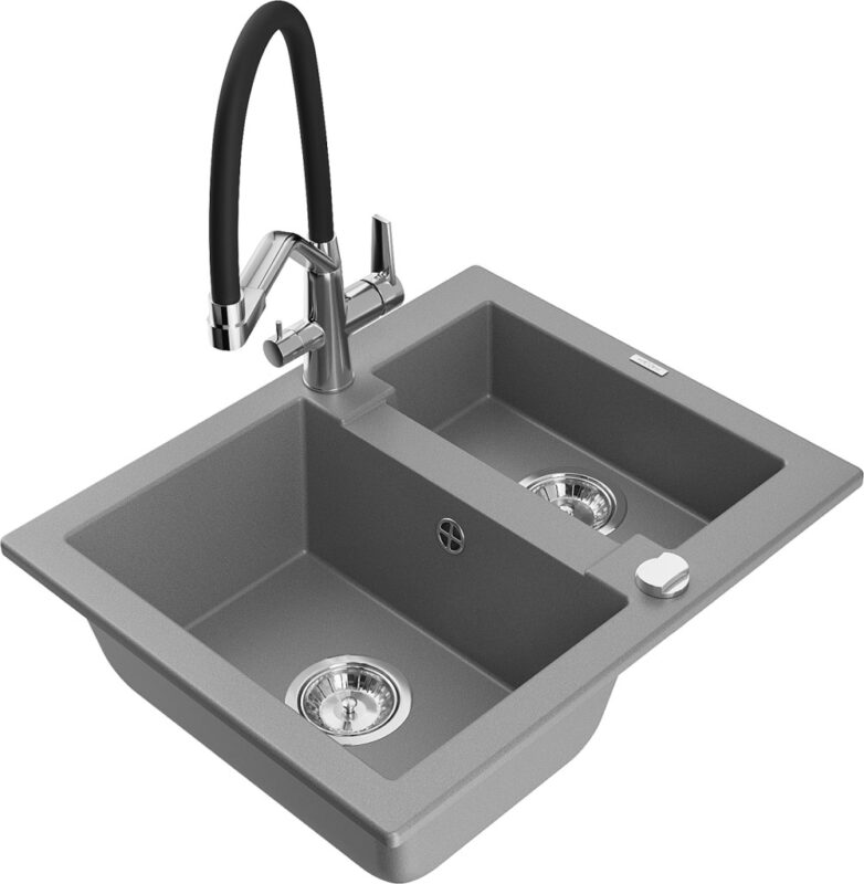 Technické dáta: drez: Rozmer: 582 x 475 x 177 mm Hĺbka komory: 162 mm (väčšia), 102 mm (menšia) Rozmery komory: 395×272 mm (väčšie), 375×182 mm (menšie) Priemer odtoku: ø90 mm Typ: 1,5 komory Typ: Zapustené do pracovnej dosky Šedá farba Povrchová úprava sifónu: Chrome Materiál: žula (80% žulové kamenivo, 20% živice) Prepadový otvor: Áno Otvory: (batérie, automatické) 2 Vysoká odolnosť proti poškriabaniu a zmene farby Odolnosť proti tepelným šokom Ľahko čistiteľný povrch kuchynská batéria: Materiál: mosadz Farba: chróm/čierna Hlavy: Keramické Prevzdušňovač: Áno Typ hubica: Flexibilný s mosadzným držiakom Rozsah výtoku: 260 mm Výška: 405 mm Typ: Dve rukoväte Dvojhlavá batéria s prídavným filtrom na pitnú vodu(GT) Ean: 5905315055668