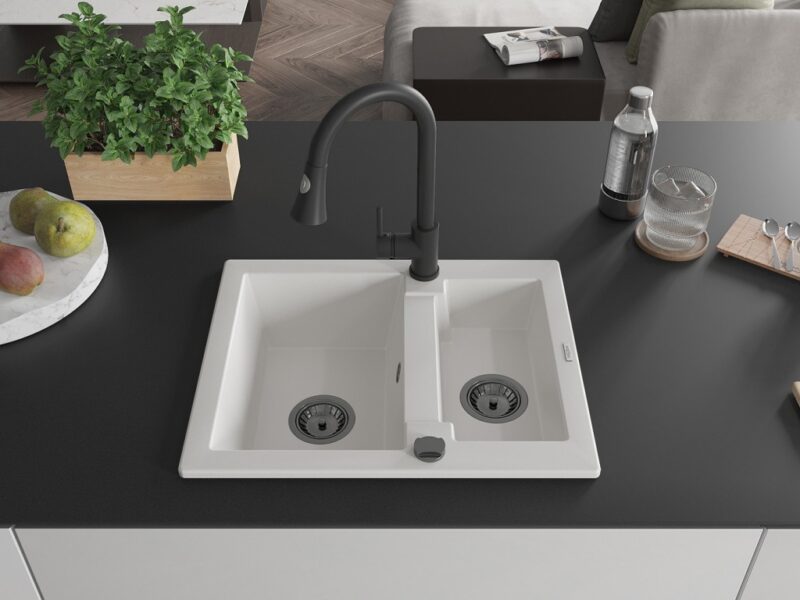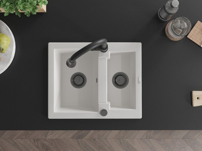 Technické dáta: drez: Rozmer: 582 x 475 x 177 mm Hĺbka komory: 162 mm (väčšia), 102 mm (menšia) Rozmery komory: 395×272 mm (väčšie), 375×182 mm (menšie) Priemer odtoku: ø90 mm Typ: 1,5 komory Typ: Zapustené do pracovnej dosky biela farba Povrchová úprava sifónu: čierna Materiál: žula (80% žulové kamenivo, 20% živice) Prepadový otvor: Áno Otvory: (batérie, automatické) 2 Vysoká odolnosť proti poškriabaniu a zmene farby Odolnosť proti tepelným šokom Ľahko čistiteľný povrch Jeden dodatočný vyfrézovaný otvor na samodierovanie ø35 kuchynská batéria: Materiál: mosadz Čierna farba Hlava: Keramická Prevzdušňovač: Áno Typ: Jedna páka Výška batérie: 380 mm Rozsah výtoku: 252 mm Typ výtoku: Výsuvný(GT) Ean: 5905315031969