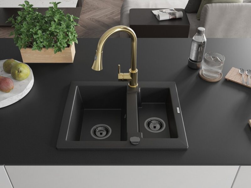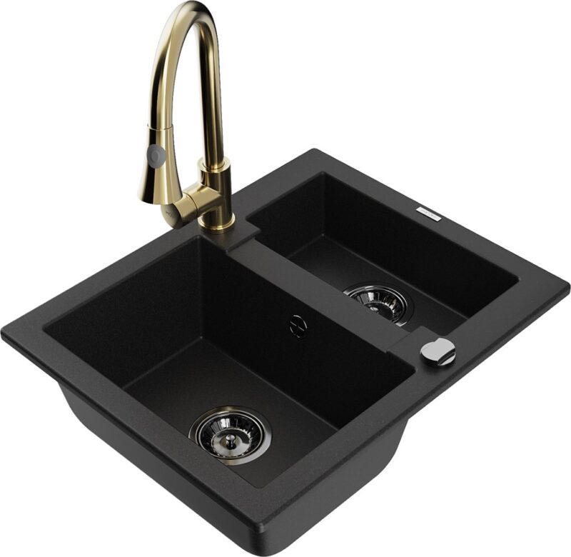 Technické dáta: drez: Rozmer: 582 x 475 x 177 mm Hĺbka komory: 162 mm (väčšia), 102 mm (menšia) Rozmery komory: 395×272 mm (väčšie), 375×182 mm (menšie) Priemer odtoku: ø90 mm Typ: 1,5 komory Typ: Zapustené do pracovnej dosky Čierna farba Povrchová úprava sifónu: čierna Materiál: žula (80% žulové kamenivo, 20% živice) Prepadový otvor: Áno Otvory: (batérie, automatické) 2 Vysoká odolnosť proti poškriabaniu a zmene farby Odolnosť proti tepelným šokom Ľahko čistiteľný povrch Jeden dodatočný vyfrézovaný otvor na samodierovanie ø35 kuchynská batéria: Materiál: mosadz Farba: Zlatá Hlava: Keramická Prevzdušňovač: Áno Typ: Jedna páka Výška batérie: 380 mm Rozsah výtoku: 252 mm Typ výtoku: Výsuvný(GT) Ean: 5905315032225