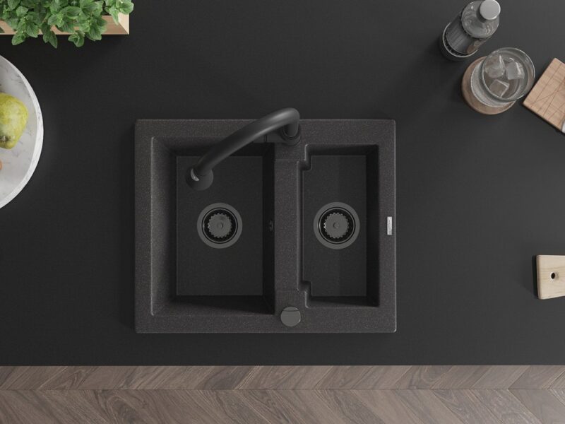 Technické dáta: Drez: Rozmer: 582x475x177 mm Hĺbka komory: 162 mm (väčšia), 102 mm (menšia) Rozmery komory: 395×272 mm (väčšie), 375×182 mm (menšie) Priemer odtoku: ø90 mm Typ: 1,5-komorový Typ: Zapustené do pracovnej dosky Farba: Škvrnitá čierna Povrchová úprava sifónu: čierna Materiál: žula (80% žulové kamenivo 20% živice) Prepadový otvor: Áno Otvory: (batérie, automat) 2 Vysoká odolnosť proti poškriabaniu a zmene farby Odolnosť proti tepelným šokom Povrch pre ľahké čistenie Jeden dodatočný vyfrézovaný otvor na samodierovanie ø35 Kuchynská batéria: Materiál: mosadz Čierna farba Hlava: Keramická Perlátor: Áno Typ: Jednopákové Výška batérie: 380 mm Rozsah výtoku: 252 mm Typ výtoku: Výsuvný(GT) Ean: 5905315032188