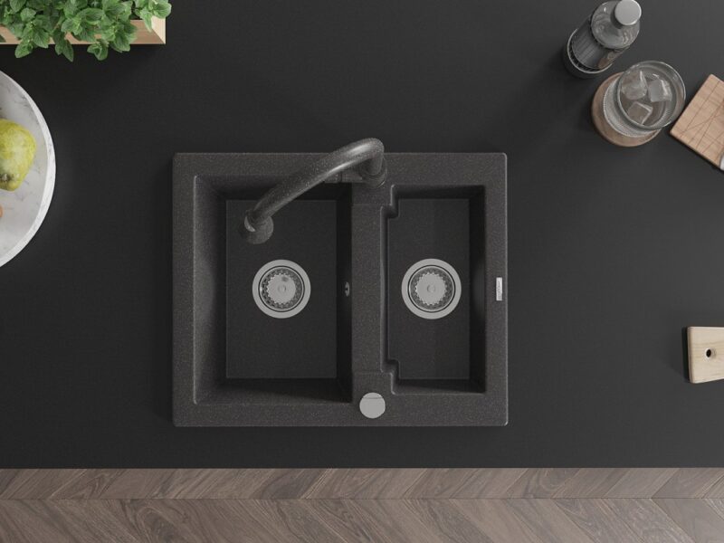 Technické dáta: Drez: Rozmer: 582x475x177 mm Hĺbka komory: 162 mm (väčšia), 102 mm (menšia) Rozmery komory: 395×272 mm (väčšie), 375×182 mm (menšie) Priemer odtoku: ø90 mm Typ: 1,5-komorový Typ: Zapustené do pracovnej dosky Farba: Škvrnitá čierna Povrchová úprava sifónu: Chrome Materiál: žula (80% žulové kamenivo 20% živice) Prepadový otvor: Áno Otvory: (batérie, automat) 2 Vysoká odolnosť proti poškriabaniu a zmene farby Odolnosť proti tepelným šokom Povrch pre ľahké čistenie Jeden dodatočný vyfrézovaný otvor na samodierovanie ø35 Kuchynská batéria: Materiál: mosadz Farba: Škvrnitá čierna Hlava: Keramická Perlátor: Áno Typ: Jednopákové Výška batérie: 380 mm Rozsah výtoku: 252 mm Typ výtoku: Výsuvný(GT) Ean: 5905315032195