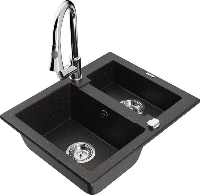 Technické dáta: drez: Rozmer: 582 x 475 x 177 mm Hĺbka komory: 162 mm (väčšia), 102 mm (menšia) Rozmery komory: 395×272 mm (väčšie), 375×182 mm (menšie) Priemer odtoku: ø90 mm Typ: 1,5 komory Typ: Zapustené do pracovnej dosky Farba: čierna / zlatá metalíza Povrchová úprava sifónu: Chrome Materiál: žula (80% žulové kamenivo, 20% živice) Prepadový otvor: Áno Otvory: (batérie, automatické) 2 Vysoká odolnosť proti poškriabaniu a zmene farby Odolnosť proti tepelným šokom Ľahko čistiteľný povrch Jeden dodatočný vyfrézovaný otvor na samodierovanie ø35 kuchynská batéria: Materiál: mosadz Farba: Chrome Hlava: Keramická Prevzdušňovač: Áno Typ: Jedna páka Výška batérie: 380 mm Rozsah výtoku: 252 mm Typ výtoku: Výsuvný(GT) Ean: 5905315032102