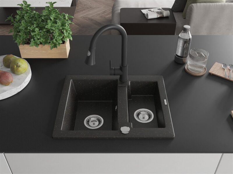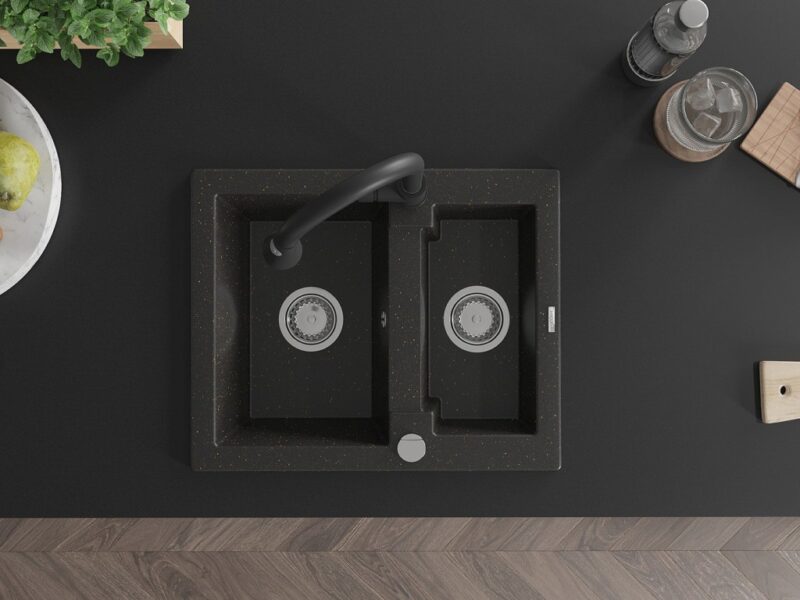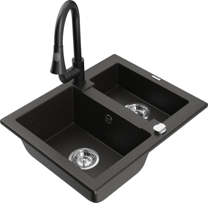 Technické dáta: drez: Rozmer: 582 x 475 x 177 mm Hĺbka komory: 162 mm (väčšia), 102 mm (menšia) Rozmery komory: 395×272 mm (väčšie), 375×182 mm (menšie) Priemer odtoku: ø90 mm Typ: 1,5 komory Typ: Zapustené do pracovnej dosky Farba: čierna / zlatá metalíza Povrchová úprava sifónu: Chrome Materiál: žula (80% žulové kamenivo, 20% živice) Prepadový otvor: Áno Otvory: (batérie, automatické) 2 Vysoká odolnosť proti poškriabaniu a zmene farby Odolnosť proti tepelným šokom Ľahko čistiteľný povrch Jeden dodatočný vyfrézovaný otvor na samodierovanie ø35 kuchynská batéria: Materiál: mosadz Čierna farba Hlava: Keramická Prevzdušňovač: Áno Typ: Jedna páka Výška batérie: 380 mm Rozsah výtoku: 252 mm Typ výtoku: Výsuvný(GT) Ean: 5905315032133