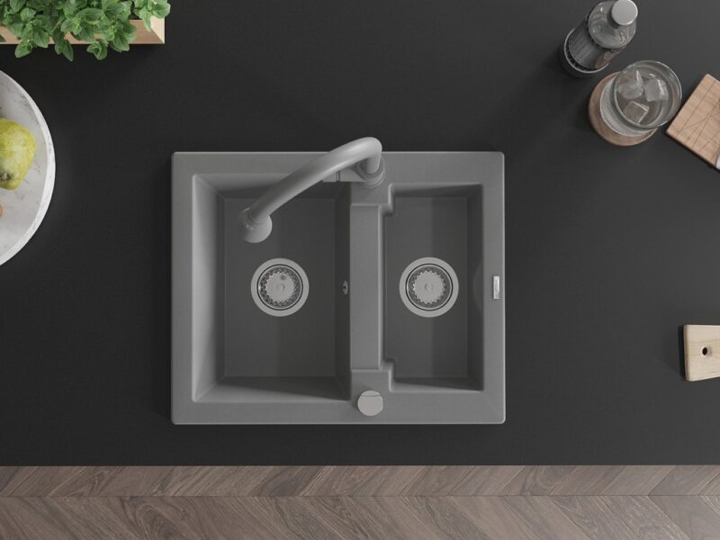 Technické dáta: drez: Rozmer: 582 x 475 x 177 mm Hĺbka komory: 162 mm (väčšia), 102 mm (menšia) Rozmery komory: 395×272 mm (väčšie), 375×182 mm (menšie) Priemer odtoku: ø90 mm Typ: 1,5 komory Typ: Zapustené do pracovnej dosky Šedá farba Povrchová úprava sifónu: Chrome Materiál: žula (80% žulové kamenivo, 20% živice) Prepadový otvor: Áno Otvory: (batérie, automatické) 2 Vysoká odolnosť proti poškriabaniu a zmene farby Odolnosť proti tepelným šokom Ľahko čistiteľný povrch Jeden dodatočný vyfrézovaný otvor na samodierovanie ø35 kuchynská batéria: Materiál: mosadz Šedá farba Hlava: Keramická Prevzdušňovač: Áno Typ: Jedna páka Výška batérie: 380 mm Rozsah výtoku: 252 mm Typ výtoku: Výsuvný(GT) Ean: 5905315032058