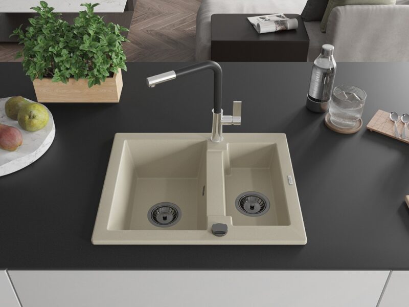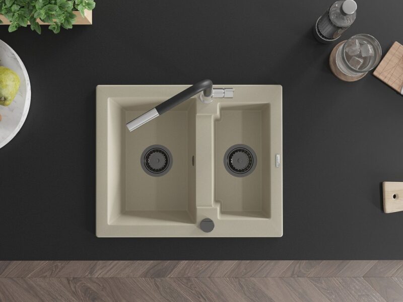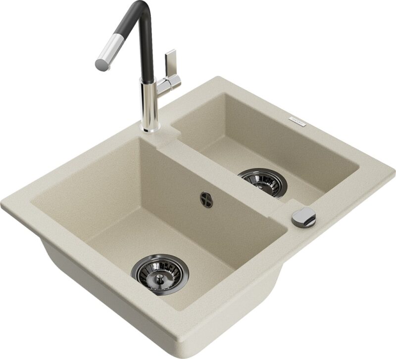 Technické dáta: drez: Rozmer: 582 x 475 x 177 mm Hĺbka komory: 162 mm (väčšia), 102 mm (menšia) Rozmery komory: 395×272 mm (väčšie), 375×182 mm (menšie) Priemer odtoku: ø90 mm Typ: 1,5 komory Typ: Zapustené do pracovnej dosky Farba béžová Povrchová úprava sifónu: čierna Materiál: žula (80% žulové kamenivo, 20% živice) Prepadový otvor: Áno Otvory: (batérie, automatické) 2 Vysoká odolnosť proti poškriabaniu a zmene farby Odolnosť proti tepelným šokom Ľahko čistiteľný povrch Jeden dodatočný vyfrézovaný otvor na samodierovanie ø35 kuchynská batéria: Materiál: mosadz Farba: chróm/čierna Hlava: Keramická Prevzdušňovač: Áno Typ: Jedna páka Rozsah výtoku: 245 mm Výška batérie: 307 mm(GT) Ean: 5905315063557