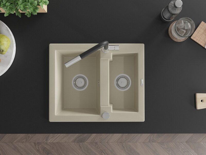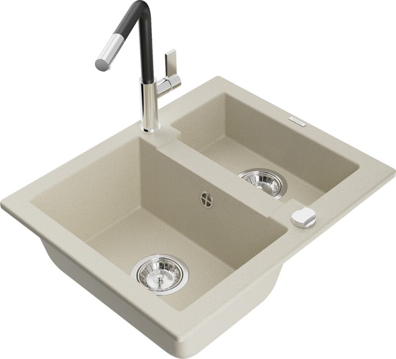 Technické dáta: drez: Rozmer: 582 x 475 x 177 mm Hĺbka komory: 162 mm (väčšia), 102 mm (menšia) Rozmery komory: 395×272 mm (väčšie), 375×182 mm (menšie) Priemer odtoku: ø90 mm Typ: 1,5 komory Typ: Zapustené do pracovnej dosky Farba béžová Povrchová úprava sifónu: Chrome Materiál: žula (80% žulové kamenivo, 20% živice) Prepadový otvor: Áno Otvory: (batérie, automatické) 2 Vysoká odolnosť proti poškriabaniu a zmene farby Odolnosť proti tepelným šokom Ľahko čistiteľný povrch Jeden dodatočný vyfrézovaný otvor na samodierovanie ø35 kuchynská batéria: Materiál: mosadz Farba: chróm/čierna Hlava: Keramická Prevzdušňovač: Áno Typ: Jedna páka Rozsah výtoku: 245 mm Výška batérie: 307 mm(GT) Ean: 5905315063540