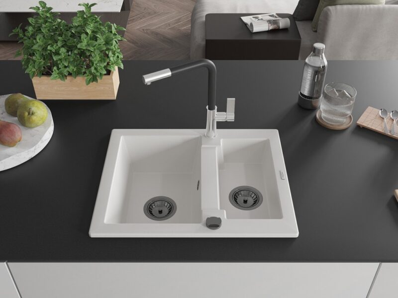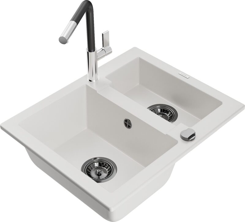 Technické dáta: drez: Rozmer: 582 x 475 x 177 mm Hĺbka komory: 162 mm (väčšia), 102 mm (menšia) Rozmery komory: 395×272 mm (väčšie), 375×182 mm (menšie) Priemer odtoku: ø90 mm Typ: 1,5 komory Typ: Zapustené do pracovnej dosky biela farba Povrchová úprava sifónu: čierna Materiál: žula (80% žulové kamenivo, 20% živice) Prepadový otvor: Áno Otvory: (batérie, automatické) 2 Vysoká odolnosť proti poškriabaniu a zmene farby Odolnosť proti tepelným šokom Ľahko čistiteľný povrch Jeden dodatočný vyfrézovaný otvor na samodierovanie ø35 kuchynská batéria: Materiál: mosadz Farba: chróm/čierna Hlava: Keramická Prevzdušňovač: Áno Typ: Jedna páka Rozsah výtoku: 245 mm Výška batérie: 307 mm(GT) Ean: 5905315063496