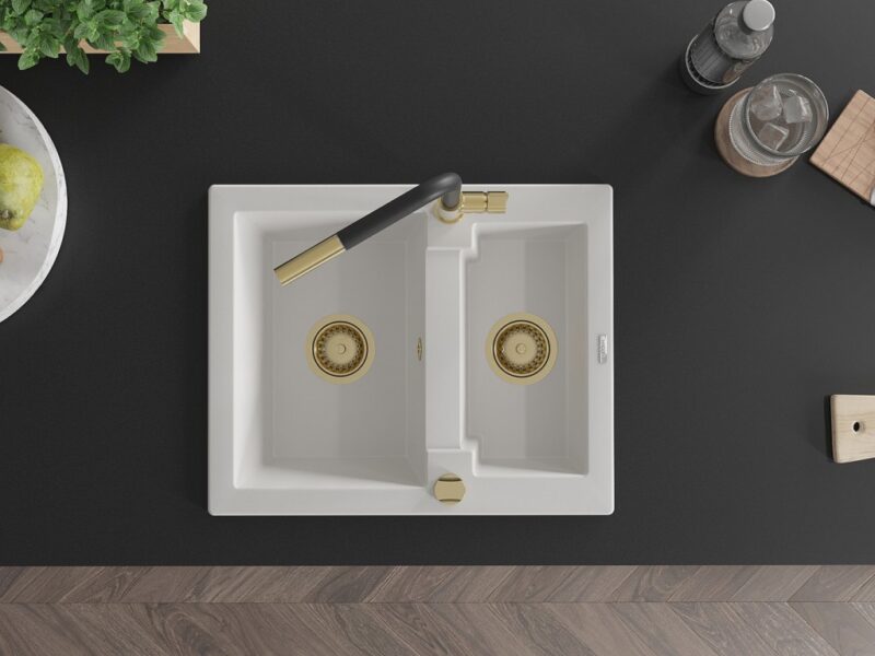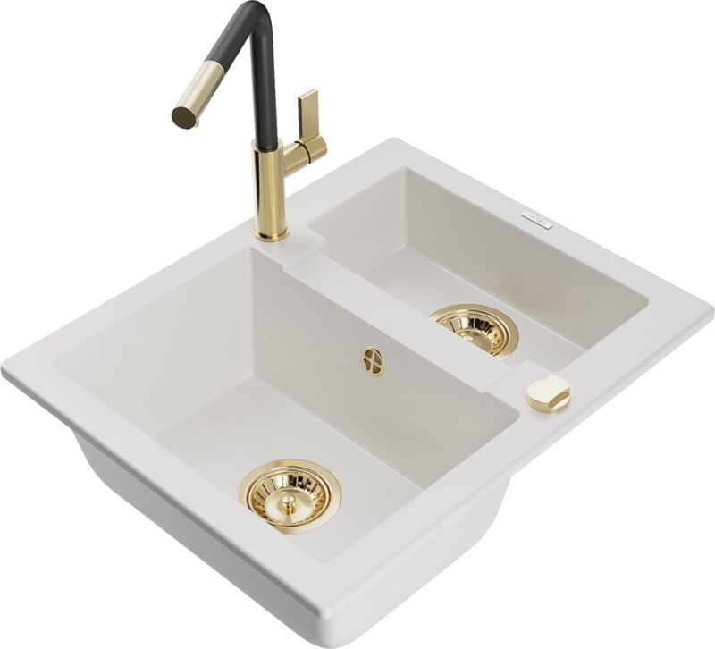 Technické dáta: drez: Rozmer: 582 x 475 x 177 mm Hĺbka komory: 162 mm (väčšia), 102 mm (menšia) Rozmery komory: 395×272 mm (väčšie), 375×182 mm (menšie) Priemer odtoku: ø90 mm Typ: 1,5 komory Typ: Zapustené do pracovnej dosky biela farba Povrchová úprava sifónu: zlatá Materiál: žula (80% žulové kamenivo, 20% živice) Prepadový otvor: Áno Otvory: (batérie, automatické) 2 Vysoká odolnosť proti poškriabaniu a zmene farby Odolnosť proti tepelným šokom Ľahko čistiteľný povrch Jeden dodatočný vyfrézovaný otvor na samodierovanie ø35 kuchynská batéria: Materiál: mosadz Farba: Zlatá/Čierna Hlava: Keramická Prevzdušňovač: Áno Typ: Jedna páka Rozsah výtoku: 245 mm Výška batérie: 307 mm(GT) Ean: 5905315063502