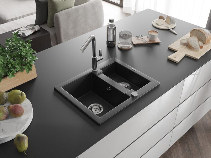 Technické dáta: drez: Rozmer: 582 x 475 x 177 mm Hĺbka komory: 162 mm (väčšia), 102 mm (menšia) Rozmery komory: 395×272 mm (väčšie), 375×182 mm (menšie) Priemer odtoku: ø90 mm Typ: 1,5 komory Typ: Zapustené do pracovnej dosky Čierna farba Povrchová úprava sifónu: Chrome Materiál: žula (80% žulové kamenivo, 20% živice) Prepadový otvor: Áno Otvory: (batérie, automatické) 2 Vysoká odolnosť proti poškriabaniu a zmene farby Odolnosť proti tepelným šokom Ľahko čistiteľný povrch Jeden dodatočný vyfrézovaný otvor na samodierovanie ø35 kuchynská batéria: Materiál: mosadz Farba: Chrome Hlava: Keramická Prevzdušňovač: Áno Typ: Jedna páka Rozsah výtoku: 245 mm Výška batérie: 307 mm(GT) Ean: 5905315063892