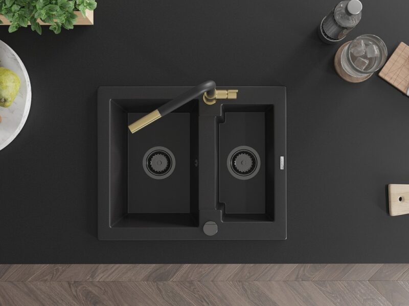 Technické dáta: drez: Rozmer: 582 x 475 x 177 mm Hĺbka komory: 162 mm (väčšia), 102 mm (menšia) Rozmery komory: 395×272 mm (väčšie), 375×182 mm (menšie) Priemer odtoku: ø90 mm Typ: 1,5 komory Typ: Zapustené do pracovnej dosky Čierna farba Povrchová úprava sifónu: čierna Materiál: žula (80% žulové kamenivo, 20% živice) Prepadový otvor: Áno Otvory: (batérie, automatické) 2 Vysoká odolnosť proti poškriabaniu a zmene farby Odolnosť proti tepelným šokom Ľahko čistiteľný povrch Jeden dodatočný vyfrézovaný otvor na samodierovanie ø35 kuchynská batéria: Materiál: mosadz Farba: Zlatá/Čierna Hlava: Keramická Prevzdušňovač: Áno Typ: Jedna páka Rozsah výtoku: 245 mm Výška batérie: 307 mm(GT) Ean: 5905315063939