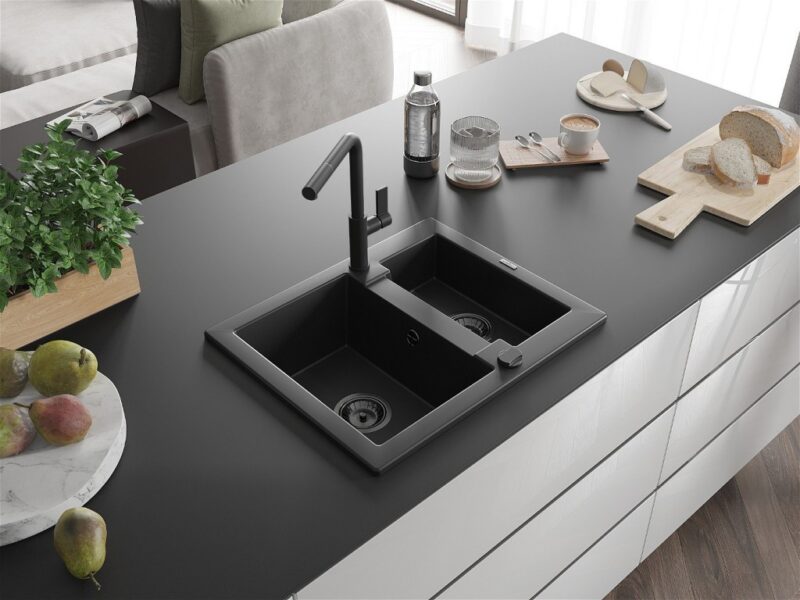 Technické dáta: drez: Rozmer: 582 x 475 x 177 mm Hĺbka komory: 162 mm (väčšia), 102 mm (menšia) Rozmery komory: 395×272 mm (väčšie), 375×182 mm (menšie) Priemer odtoku: ø90 mm Typ: 1,5 komory Typ: Zapustené do pracovnej dosky Čierna farba Povrchová úprava sifónu: čierna Materiál: žula (80% žulové kamenivo, 20% živice) Prepadový otvor: Áno Otvory: (batérie, automatické) 2 Vysoká odolnosť proti poškriabaniu a zmene farby Odolnosť proti tepelným šokom Ľahko čistiteľný povrch Jeden dodatočný vyfrézovaný otvor na samodierovanie ø35 kuchynská batéria: Materiál: mosadz Čierna farba Hlava: Keramická Prevzdušňovač: Áno Typ: Jedna páka Rozsah výtoku: 245 mm Výška batérie: 307 mm(GT) Ean: 5905315063946