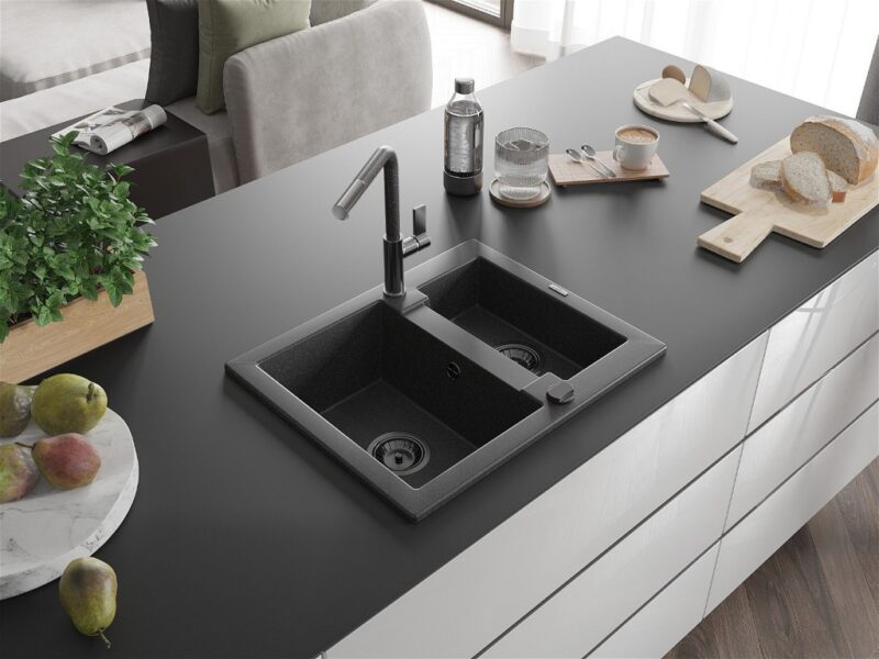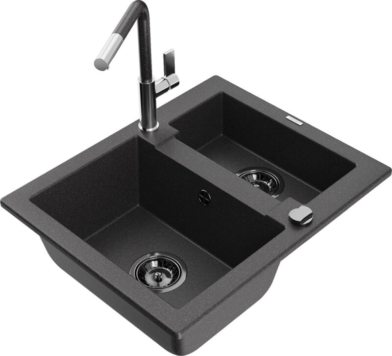 Technické dáta: Drez: Rozmer: 582x475x177 mm Hĺbka komory: 162 mm (väčšia), 102 mm (menšia) Rozmery komory: 395×272 mm (väčšie), 375×182 mm (menšie) Priemer odtoku: ø90 mm Typ: 1,5-komorový Typ: Zapustené do pracovnej dosky Farba: Škvrnitá čierna Povrchová úprava sifónu: čierna Materiál: žula (80% žulové kamenivo 20% živice) Prepadový otvor: Áno Otvory: (batérie, automat) 2 Vysoká odolnosť proti poškriabaniu a zmene farby Odolnosť proti tepelným šokom Povrch pre ľahké čistenie Jeden dodatočný vyfrézovaný otvor na samodierovanie ø35 Kuchynská batéria: Materiál: mosadz Farba: chróm/čierna škvrnitá Hlava: Keramická Perlátor: Áno Typ: Jednopákové Rozsah výtoku: 245 mm Výška batérie: 307 mm(GT) Ean: 5905315063830