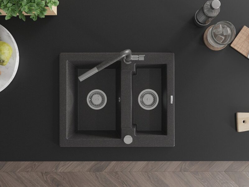 Technické dáta: Drez: Rozmer: 582x475x177 mm Hĺbka komory: 162 mm (väčšia), 102 mm (menšia) Rozmery komory: 395×272 mm (väčšie), 375×182 mm (menšie) Priemer odtoku: ø90 mm Typ: 1,5-komorový Typ: Zapustené do pracovnej dosky Farba: Škvrnitá čierna Povrchová úprava sifónu: Chrome Materiál: žula (80% žulové kamenivo 20% živice) Prepadový otvor: Áno Otvory: (batérie, automat) 2 Vysoká odolnosť proti poškriabaniu a zmene farby Odolnosť proti tepelným šokom Povrch pre ľahké čistenie Jeden dodatočný vyfrézovaný otvor na samodierovanie ø35 Kuchynská batéria: Materiál: mosadz Farba: chróm/čierna škvrnitá Hlava: Keramická Perlátor: Áno Typ: Jednopákové Rozsah výtoku: 245 mm Výška batérie: 307 mm(GT) Ean: 5905315063823