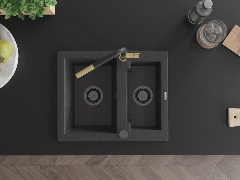 Technické dáta: Drez: Rozmer: 582x475x177 mm Hĺbka komory: 162 mm (väčšia), 102 mm (menšia) Rozmery komory: 395×272 mm (väčšie), 375×182 mm (menšie) Priemer odtoku: ø90 mm Typ: 1,5-komorový Typ: Zapustené do pracovnej dosky Farba: Škvrnitá čierna Povrchová úprava sifónu: čierna Materiál: žula (80% žulové kamenivo 20% živice) Prepadový otvor: Áno Otvory: (batérie, automat) 2 Vysoká odolnosť proti poškriabaniu a zmene farby Odolnosť proti tepelným šokom Povrch pre ľahké čistenie Jeden dodatočný vyfrézovaný otvor na samodierovanie ø35 Kuchynská batéria: Materiál: mosadz Farba: Zlatá/Čierna Hlava: Keramická Perlátor: Áno Typ: Jednopákové Rozsah výtoku: 245 mm Výška batérie: 307 mm(GT) Ean: 5905315063854