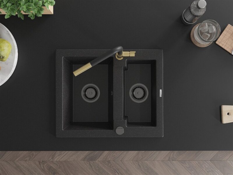 Technické dáta: Drez: Rozmer: 582x475x177 mm Hĺbka komory: 162 mm (väčšia), 102 mm (menšia) Rozmery komory: 395×272 mm (väčšie), 375×182 mm (menšie) Priemer odtoku: ø90 mm Typ: 1,5-komorový Typ: Zapustené do pracovnej dosky Farba: čierna/strieborná metalíza Povrchová úprava sifónu: čierna Materiál: žula (80% žulové kamenivo 20% živice) Prepadový otvor: Áno Otvory: (batérie, automat) 2 Vysoká odolnosť proti poškriabaniu a zmene farby Odolnosť proti tepelným šokom Povrch pre ľahké čistenie Jeden dodatočný vyfrézovaný otvor na samodierovanie ø35 Kuchynská batéria: Materiál: mosadz Farba: Zlatá/Čierna Hlava: Keramická Perlátor: Áno Typ: Jednopákové Rozsah výtoku: 245 mm Výška batérie: 307 mm(GT) Ean: 5905315063717
