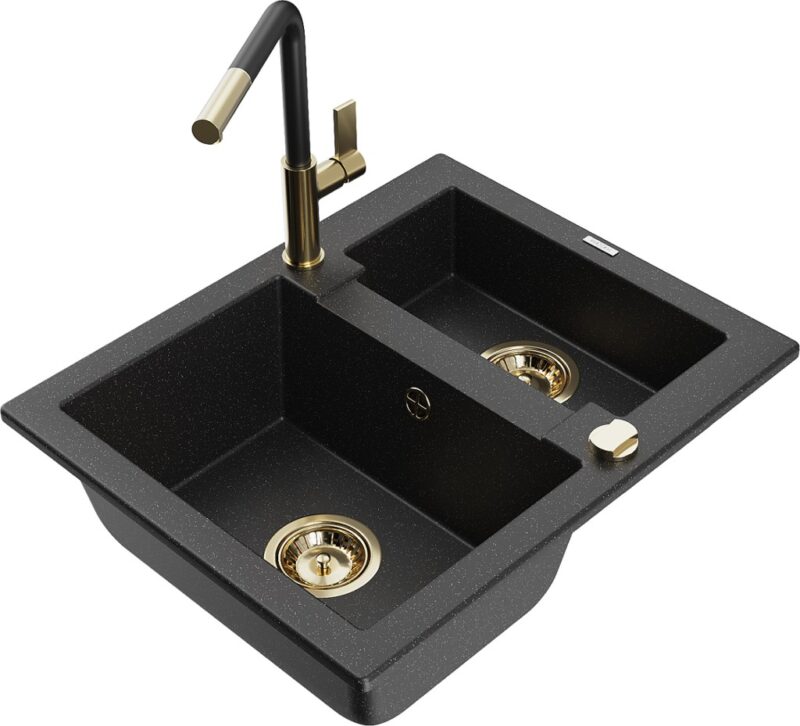 Technické dáta: Drez: Rozmer: 582x475x177 mm Hĺbka komory: 162 mm (väčšia), 102 mm (menšia) Rozmery komory: 395×272 mm (väčšie), 375×182 mm (menšie) Priemer odtoku: ø90 mm Typ: 1,5-komorový Typ: Zapustené do pracovnej dosky Farba: čierna/strieborná metalíza Povrchová úprava sifónu: zlatá Materiál: žula (80% žulové kamenivo 20% živice) Prepadový otvor: Áno Otvory: (batérie, automat) 2 Vysoká odolnosť proti poškriabaniu a zmene farby Odolnosť proti tepelným šokom Povrch pre ľahké čistenie Jeden dodatočný vyfrézovaný otvor na samodierovanie ø35 Kuchynská batéria: Materiál: mosadz Farba: Zlatá/Čierna Hlava: Keramická Perlátor: Áno Typ: Jednopákové Rozsah výtoku: 245 mm Výška batérie: 307 mm(GT) Ean: 5905315063700