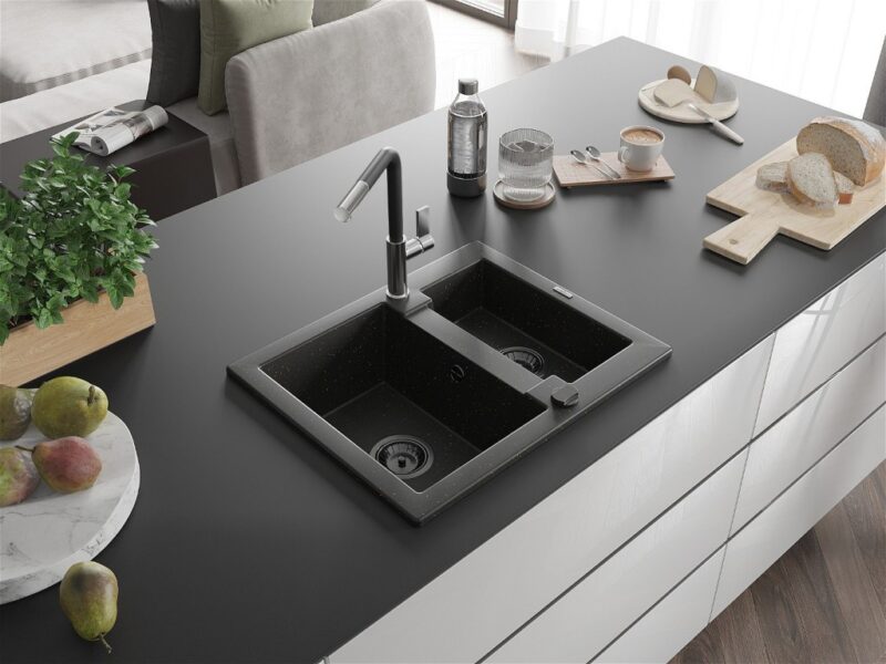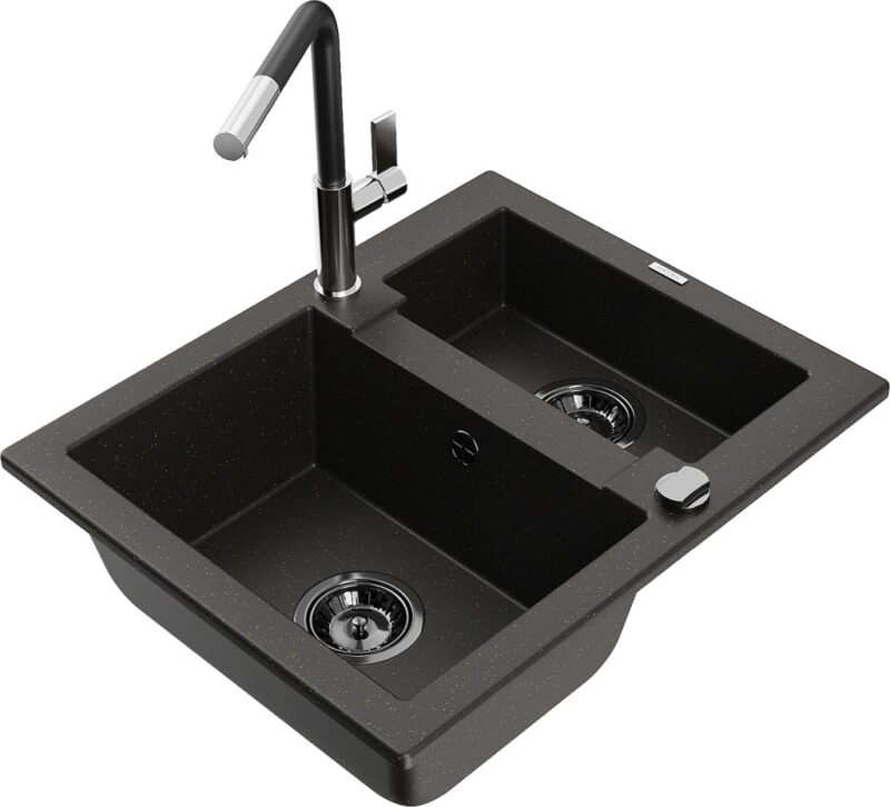 Technické dáta: drez: Rozmer: 582 x 475 x 177 mm Hĺbka komory: 162 mm (väčšia), 102 mm (menšia) Rozmery komory: 395×272 mm (väčšie), 375×182 mm (menšie) Priemer odtoku: ø90 mm Typ: 1,5 komory Typ: Zapustené do pracovnej dosky Farba: čierna / zlatá metalíza Povrchová úprava sifónu: čierna Materiál: žula (80% žulové kamenivo, 20% živice) Prepadový otvor: Áno Otvory: (batérie, automatické) 2 Vysoká odolnosť proti poškriabaniu a zmene farby Odolnosť proti tepelným šokom Ľahko čistiteľný povrch Jeden dodatočný vyfrézovaný otvor na samodierovanie ø35 kuchynská batéria: Materiál: mosadz Farba: chróm/čierna Hlava: Keramická Prevzdušňovač: Áno Typ: Jedna páka Rozsah výtoku: 245 mm Výška batérie: 307 mm(GT) Ean: 5905315063755