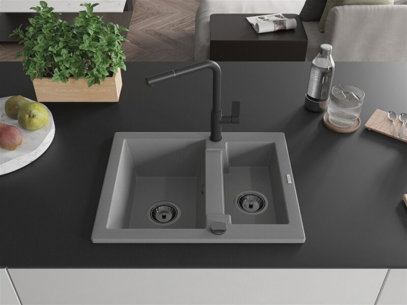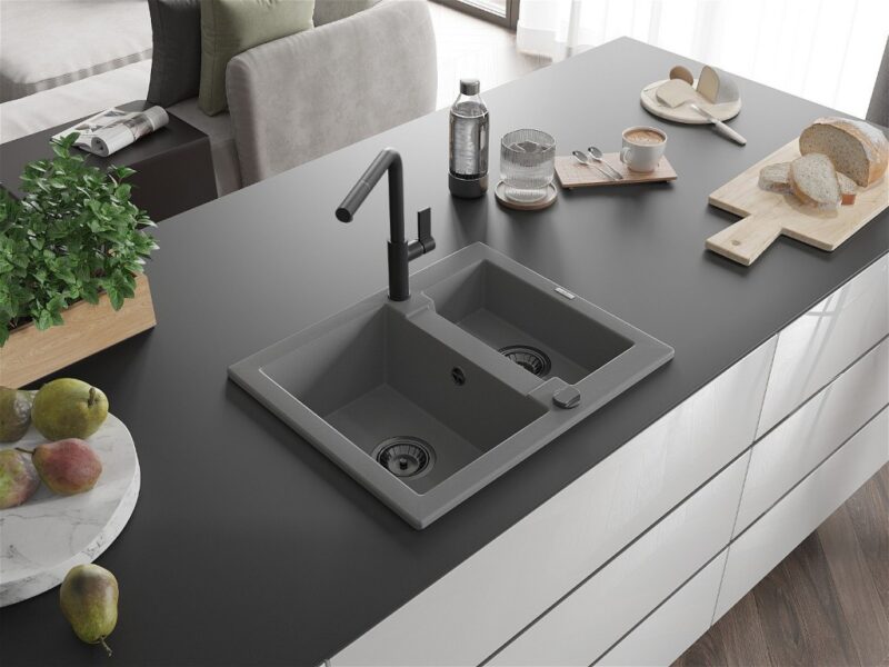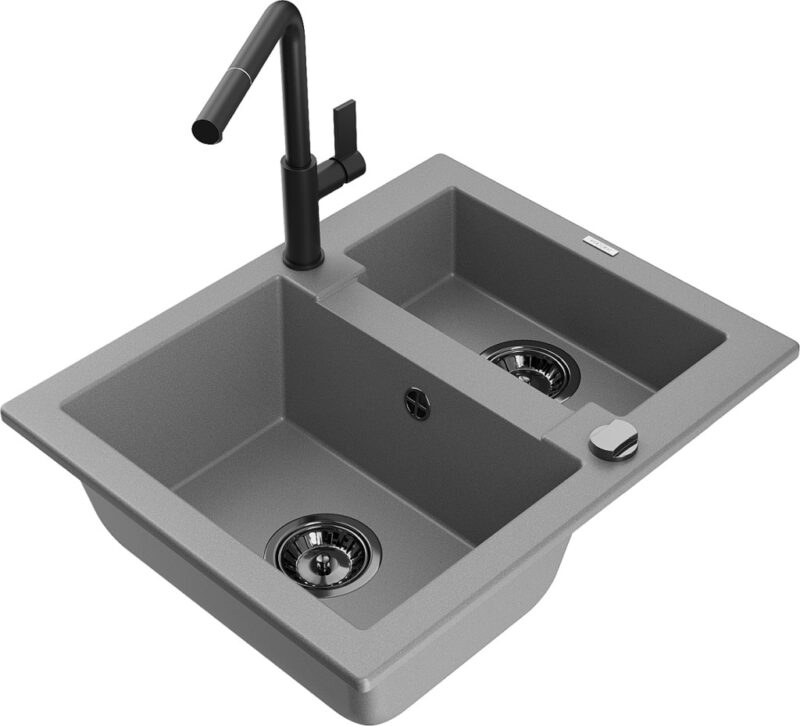 Technické dáta: drez: Rozmer: 582 x 475 x 177 mm Hĺbka komory: 162 mm (väčšia), 102 mm (menšia) Rozmery komory: 395×272 mm (väčšie), 375×182 mm (menšie) Priemer odtoku: ø90 mm Typ: 1,5 komory Typ: Zapustené do pracovnej dosky Šedá farba Povrchová úprava sifónu: čierna Materiál: žula (80% žulové kamenivo, 20% živice) Prepadový otvor: Áno Otvory: (batérie, automatické) 2 Vysoká odolnosť proti poškriabaniu a zmene farby Odolnosť proti tepelným šokom Ľahko čistiteľný povrch Jeden dodatočný vyfrézovaný otvor na samodierovanie ø35 kuchynská batéria: Materiál: mosadz Čierna farba Hlava: Keramická Prevzdušňovač: Áno Typ: Jedna páka Rozsah výtoku: 245 mm Výška batérie: 307 mm(GT) Ean: 5905315063663