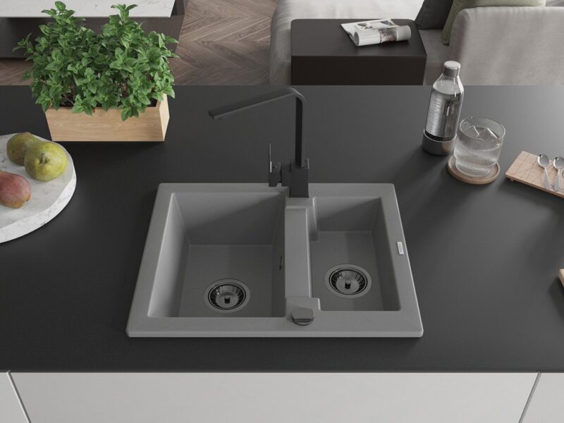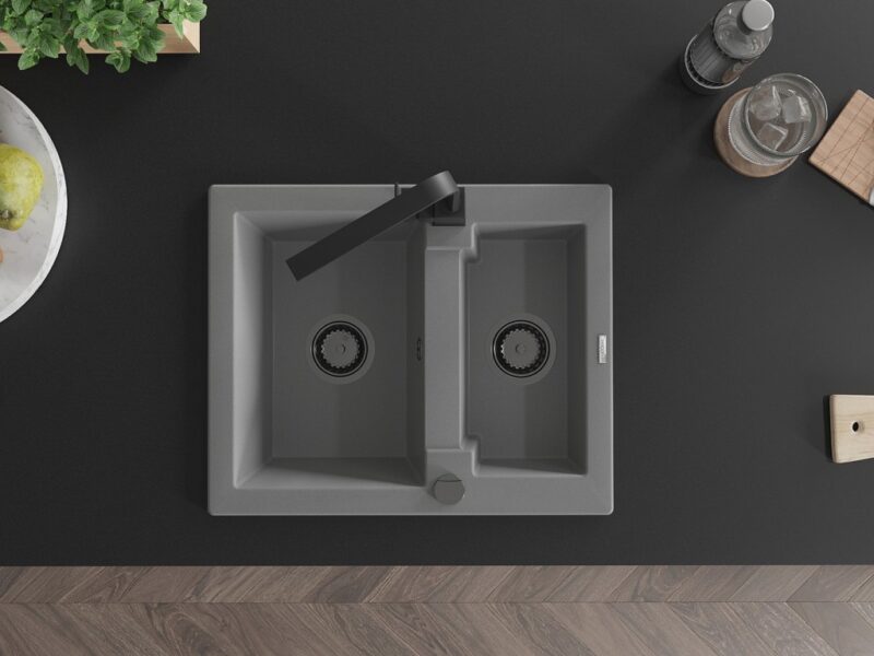 Technické dáta: drez: Rozmer: 582 x 475 x 177 mm Hĺbka komory: 162 mm (väčšia), 102 mm (menšia) Rozmery komory: 395×272 mm (väčšie), 375×182 mm (menšie) Priemer odtoku: ø90 mm Typ: 1,5 komory Typ: Zapustené do pracovnej dosky Šedá farba Povrchová úprava sifónu: čierna Materiál: žula (80% žulové kamenivo, 20% živice) Prepadový otvor: Áno Otvory: (batérie, automatické) 2 Vysoká odolnosť proti poškriabaniu a zmene farby Odolnosť proti tepelným šokom Ľahko čistiteľný povrch Jeden dodatočný vyfrézovaný otvor na samodierovanie ø35 kuchynská batéria: Materiál: mosadz Čierna farba Hlava: Keramická Prevzdušňovač: Áno Typ: Jedna páka Výška batérie: 290 mm Rozsah výtoku: 220 mm(GT) Ean: 5905315021809