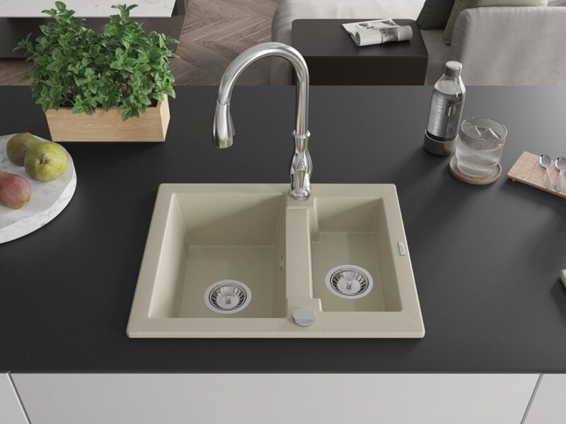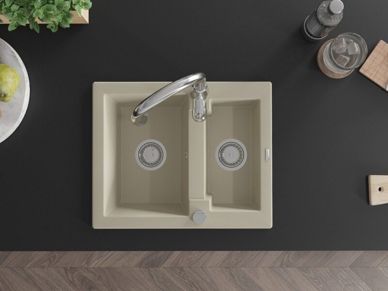 Technické dáta: drez: Rozmer: 582 x 475 x 177 mm Hĺbka komory: 162 mm (väčšia), 102 mm (menšia) Rozmery komory: 395×272 mm (väčšie), 375×182 mm (menšie) Priemer odtoku: ø90 mm Typ: 1,5 komory Typ: Zapustené do pracovnej dosky Farba béžová Povrchová úprava sifónu: Chrome Materiál: žula (80% žulové kamenivo, 20% živice) Prepadový otvor: Áno Otvory: (batérie, automatické) 2 Vysoká odolnosť proti poškriabaniu a zmene farby Odolnosť proti tepelným šokom Ľahko čistiteľný povrch Jeden dodatočný vyfrézovaný otvor na samodierovanie ø35 kuchynská batéria: Materiál: mosadz Farba: Chrome Hlava: Keramická Prevzdušňovač: Áno Typ: Jedna páka Výška batérie: 410 mm Rozsah výtoku: 231 mm(GT) Ean: 5905315037084