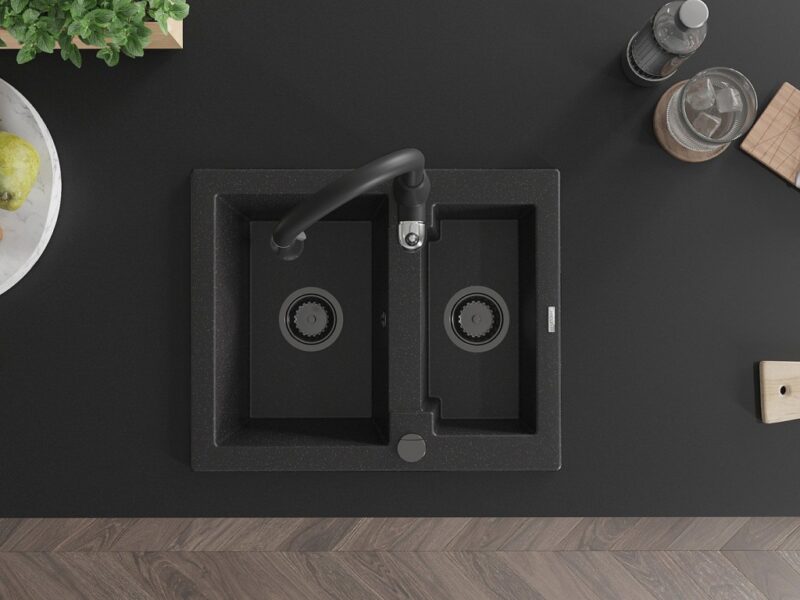 Technické dáta: drez: Rozmer: 582 x 475 x 177 mm Hĺbka komory: 162 mm (väčšia), 102 mm (menšia) Rozmery komory: 395×272 mm (väčšie), 375×182 mm (menšie) Priemer odtoku: ø90 mm Typ: 1,5 komory Typ: Zapustené do pracovnej dosky Farba: čierna/strieborná metalíza Povrchová úprava sifónu: čierna Materiál: žula (80% žulové kamenivo, 20% živice) Prepadový otvor: Áno Otvory: (batérie, automatické) 2 Vysoká odolnosť proti poškriabaniu a zmene farby Odolnosť proti tepelným šokom Ľahko čistiteľný povrch Jeden dodatočný vyfrézovaný otvor na samodierovanie ø35 kuchynská batéria: Materiál: mosadz Čierna farba Hlava: Keramická Prevzdušňovač: Áno Typ: Jedna páka Výška batérie: 410 mm Rozsah výtoku: 231 mm(GT) Ean: 5905315037206