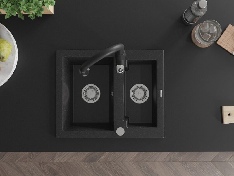 Technické dáta: drez: Rozmer: 582 x 475 x 177 mm Hĺbka komory: 162 mm (väčšia), 102 mm (menšia) Rozmery komory: 395×272 mm (väčšie), 375×182 mm (menšie) Priemer odtoku: ø90 mm Typ: 1,5 komory Typ: Zapustené do pracovnej dosky Farba: čierna/strieborná metalíza Povrchová úprava sifónu: Chrome Materiál: žula (80% žulové kamenivo, 20% živice) Prepadový otvor: Áno Otvory: (batérie, automatické) 2 Vysoká odolnosť proti poškriabaniu a zmene farby Odolnosť proti tepelným šokom Ľahko čistiteľný povrch Jeden dodatočný vyfrézovaný otvor na samodierovanie ø35 kuchynská batéria: Materiál: mosadz Čierna farba Hlava: Keramická Prevzdušňovač: Áno Typ: Jedna páka Výška batérie: 410 mm Rozsah výtoku: 231 mm(GT) Ean: 5905315037190