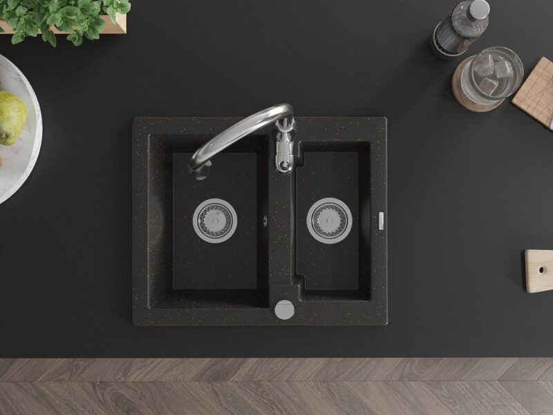 Technické dáta: drez: Rozmer: 582 x 475 x 177 mm Hĺbka komory: 162 mm (väčšia), 102 mm (menšia) Rozmery komory: 395×272 mm (väčšie), 375×182 mm (menšie) Priemer odtoku: ø90 mm Typ: 1,5 komory Typ: Zapustené do pracovnej dosky Farba: čierna / zlatá metalíza Povrchová úprava sifónu: Chrome Materiál: žula (80% žulové kamenivo, 20% živice) Prepadový otvor: Áno Otvory: (batérie, automatické) 2 Vysoká odolnosť proti poškriabaniu a zmene farby Odolnosť proti tepelným šokom Ľahko čistiteľný povrch Jeden dodatočný vyfrézovaný otvor na samodierovanie ø35 kuchynská batéria: Materiál: mosadz Farba: Chrome Hlava: Keramická Prevzdušňovač: Áno Typ: Jedna páka Výška batérie: 410 mm Rozsah výtoku: 231 mm(GT) Ean: 5905315037213