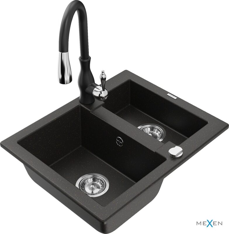 MEXEN/S MEXEN/S – Carlos granitový drez 1.5 vrátane batérie Savita, čierna/zlatá metalik 6518-75-672601-70