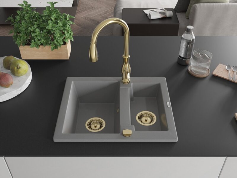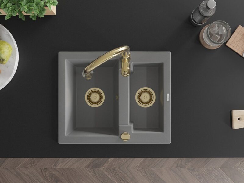 Technické dáta: drez: Rozmer: 582 x 475 x 177 mm Hĺbka komory: 162 mm (väčšia), 102 mm (menšia) Rozmery komory: 395×272 mm (väčšie), 375×182 mm (menšie) Priemer odtoku: ø90 mm Typ: 1,5 komory Typ: Zapustené do pracovnej dosky Šedá farba Povrchová úprava sifónu: zlatá Materiál: žula (80% žulové kamenivo, 20% živice) Prepadový otvor: Áno Otvory: (batérie, automatické) 2 Vysoká odolnosť proti poškriabaniu a zmene farby Odolnosť proti tepelným šokom Ľahko čistiteľný povrch Jeden dodatočný vyfrézovaný otvor na samodierovanie ø35 kuchynská batéria: Materiál: mosadz Farba: Zlatá Hlava: Keramická Prevzdušňovač: Áno Typ: Jedna páka Výška batérie: 410 mm Rozsah výtoku: 231 mm(GT) Ean: 5905315037138