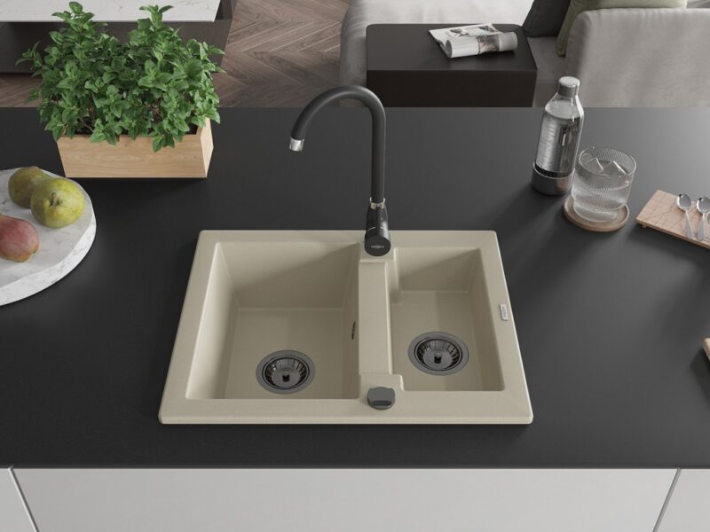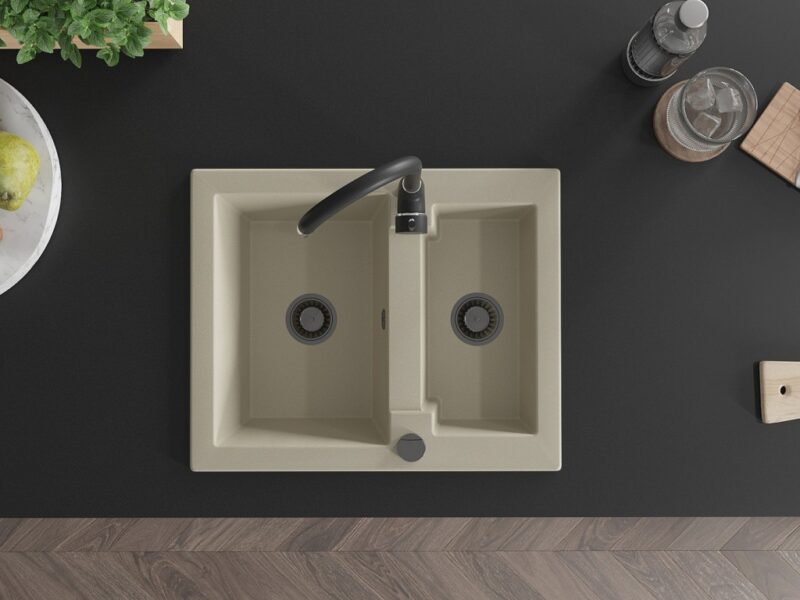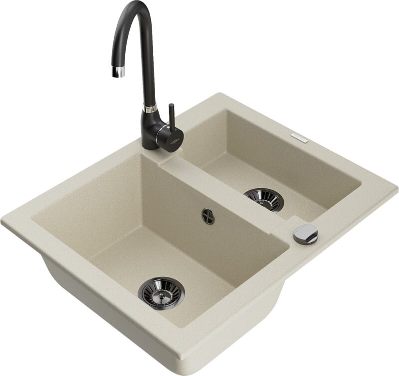 Technické dáta: drez: Rozmer: 582 x 475 x 177 mm Hĺbka komory: 162 mm (väčšia), 102 mm (menšia) Rozmery komory: 395×272 mm (väčšie), 375×182 mm (menšie) Priemer odtoku: ø90 mm Typ: 1,5 komory Typ: Zapustené do pracovnej dosky Farba béžová Povrchová úprava sifónu: čierna Materiál: žula (80% žulové kamenivo, 20% živice) Prepadový otvor: Áno Otvory: (batérie, automatické) 2 Vysoká odolnosť proti poškriabaniu a zmene farby Odolnosť proti tepelným šokom Ľahko čistiteľný povrch Jeden dodatočný vyfrézovaný otvor na samodierovanie ø35 kuchynská batéria: Materiál: mosadz Čierna farba Hlava: Keramická Prevzdušňovač: Áno Typ: Jedna páka Výška batérie: 335 mm Rozsah výtoku: 180 mm(GT) Ean: 5905315016645
