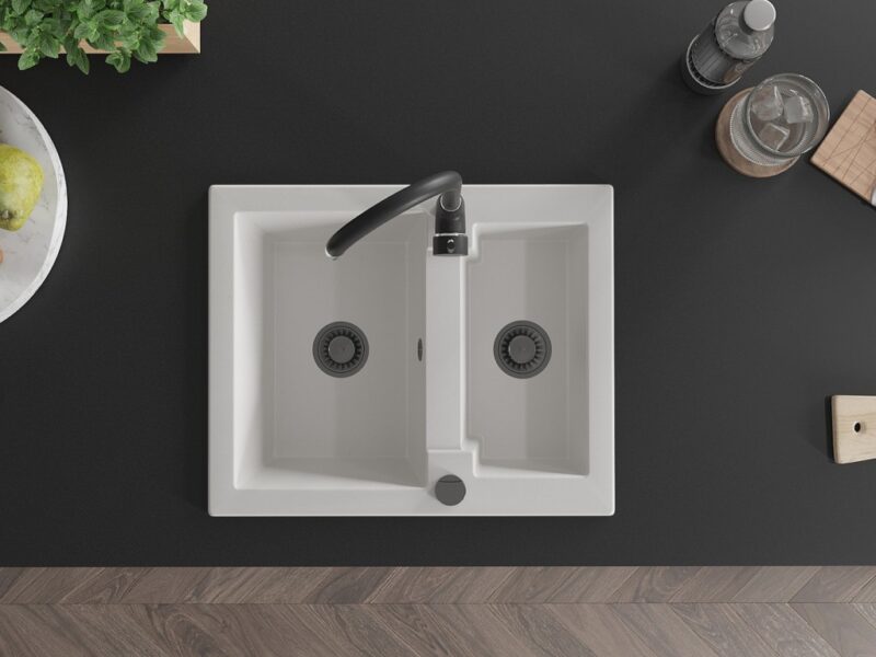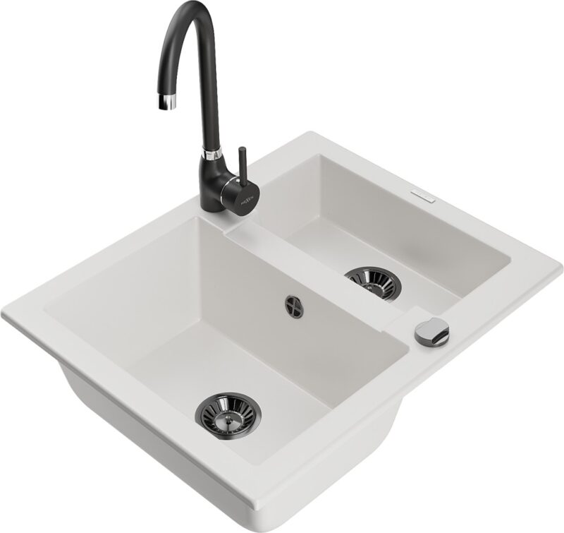 Technické dáta: drez: Rozmer: 582 x 475 x 177 mm Hĺbka komory: 162 mm (väčšia), 102 mm (menšia) Rozmery komory: 395×272 mm (väčšie), 375×182 mm (menšie) Priemer odtoku: ø90 mm Typ: 1,5 komory Typ: Zapustené do pracovnej dosky biela farba Povrchová úprava sifónu: čierna Materiál: žula (80% žulové kamenivo, 20% živice) Prepadový otvor: Áno Otvory: (batérie, automatické) 2 Vysoká odolnosť proti poškriabaniu a zmene farby Odolnosť proti tepelným šokom Ľahko čistiteľný povrch Jeden dodatočný vyfrézovaný otvor na samodierovanie ø35 kuchynská batéria: Materiál: mosadz Čierna farba Hlava: Keramická Prevzdušňovač: Áno Typ: Jedna páka Výška batérie: 335 mm Rozsah výtoku: 180 mm(GT) Ean: 5905315016607
