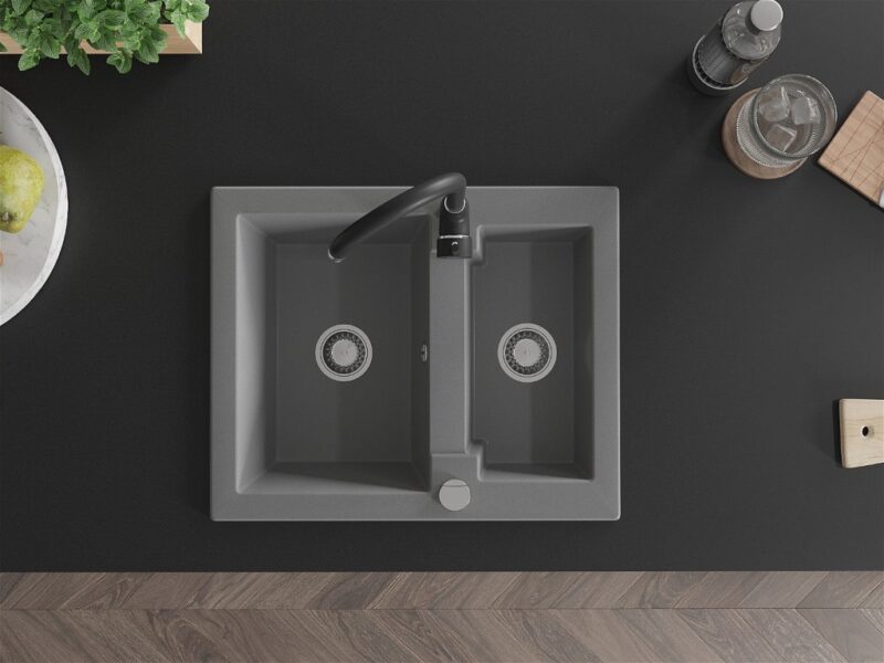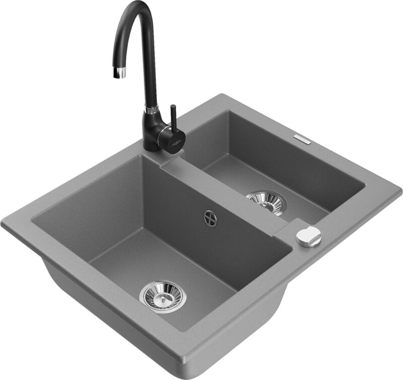 Technické dáta: drez: Rozmer: 582 x 475 x 177 mm Hĺbka komory: 162 mm (väčšia), 102 mm (menšia) Rozmery komory: 395×272 mm (väčšie), 375×182 mm (menšie) Priemer odtoku: ø90 mm Typ: 1,5 komory Typ: Zapustené do pracovnej dosky Šedá farba Povrchová úprava sifónu: Chrome Materiál: žula (80% žulové kamenivo, 20% živice) Prepadový otvor: Áno Otvory: (batérie, automatické) 2 Vysoká odolnosť proti poškriabaniu a zmene farby Odolnosť proti tepelným šokom Ľahko čistiteľný povrch Jeden dodatočný vyfrézovaný otvor na samodierovanie ø35 kuchynská batéria: Materiál: mosadz Čierna farba Hlava: Keramická Prevzdušňovač: Áno Typ: Jedna páka Výška batérie: 335 mm Rozsah výtoku: 180 mm(GT) Ean: 5905315016676