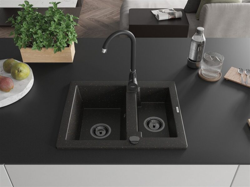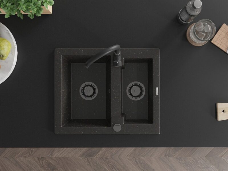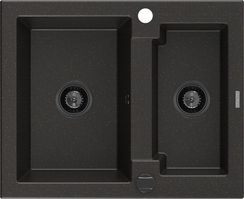 Technické dáta: Rozmer: 582 x 475 x 177 mm Hĺbka komory: 162 mm (väčšia), 102 mm (menšia) Rozmery komory: 395×272 mm (väčšie), 375×182 mm (menšie) Priemer odtoku: ø90 mm Typ: 1,5-komorový Typ: Zapustené do pracovnej dosky Materiál: žula Farba: čierna / zlatá metalíza Povrchová úprava sifónu: čierna Prepadový otvor: Áno Otvor pre batériu: Áno Vrátane automatického sifónu Vysoká odolnosť proti poškriabaniu a zmene farby Odolnosť proti tepelným šokom Ľahko čistiteľný povrch(GT) Ean: 5905315013699