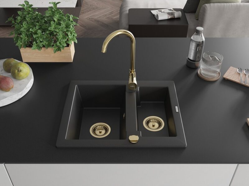 Technické dáta: Rozmer: 582 x 475 x 177 mm Hĺbka komory: 162 mm (väčšia), 102 mm (menšia) Rozmery komory: 395×272 mm (väčšie), 375×182 mm (menšie) Priemer odtoku: ø90 mm Typ: 1,5-komorový Typ: Zapustené do pracovnej dosky Materiál: žula Čierna farba Povrchová úprava sifónu: zlatá Prepadový otvor: Áno Otvor pre batériu: Áno Vrátane automatického sifónu Vysoká odolnosť proti poškriabaniu a zmene farby Odolnosť proti tepelným šokom Ľahko čistiteľný povrch(GT) Ean: 5905315012524