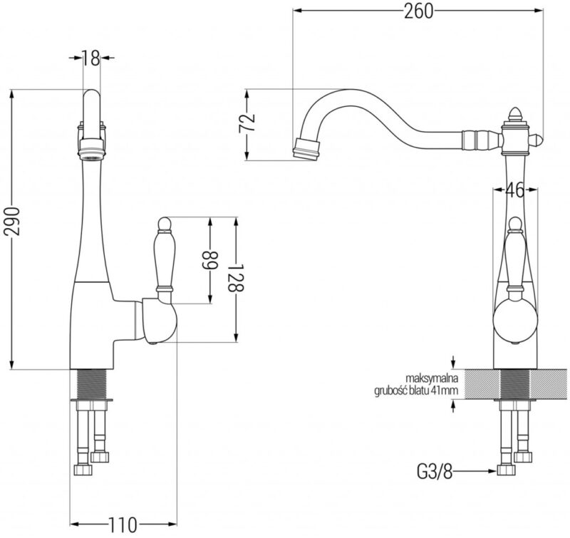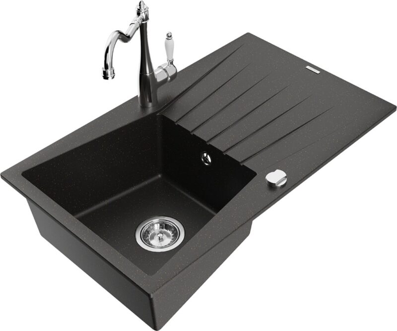Technické dáta: drez: Rozmer: 775x470x200mm Hĺbka komory: 180 mm Rozmery komory: 410×355 mm Priemer odtoku: ø90 mm Typ: 1-miska s odkvapkávačom Typ: Zapustené do pracovnej dosky Farba: čierna / zlatá metalíza Povrchová úprava sifónu: Chrome Materiál: žula (80% žulové kamenivo, 20% živice) Prepadový otvor: Áno Otvory: (batérie, automatické) 2 Inštalácia: Univerzálna, je možné inštalovať s odkvapkávačom na ľavú alebo pravú stranu Vysoká odolnosť proti poškriabaniu a zmene farby Odolnosť proti tepelným šokom Ľahko čistiteľný povrch kuchynská batéria: Materiál: mosadz Farba: Chrome Hlava: Keramická Prevzdušňovač: Áno Typ: Jedna páka Výška batérie: 290 mm Rozsah výtoku: 260 mm(GT) Ean: 5905315041074