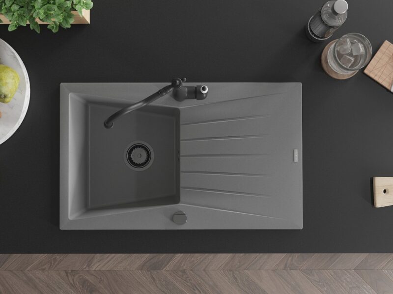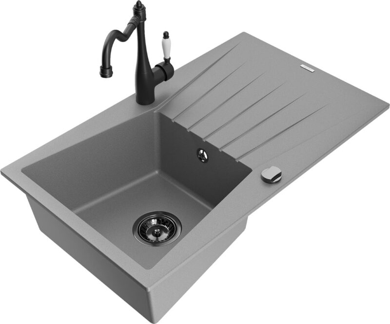 Technické dáta: drez: Rozmer: 775x470x200mm Hĺbka komory: 180 mm Rozmery komory: 410×355 mm Priemer odtoku: ø90 mm Typ: 1-miska s odkvapkávačom Typ: Zapustené do pracovnej dosky Šedá farba Povrchová úprava sifónu: čierna Materiál: žula (80% žulové kamenivo, 20% živice) Prepadový otvor: Áno Otvory: (batérie, automatické) 2 Inštalácia: Univerzálna, je možné inštalovať s odkvapkávačom na ľavú alebo pravú stranu Vysoká odolnosť proti poškriabaniu a zmene farby Odolnosť proti tepelným šokom Ľahko čistiteľný povrch kuchynská batéria: Materiál: mosadz Čierna farba Hlava: Keramická Prevzdušňovač: Áno Typ: Jedna páka Výška batérie: 290 mm Rozsah výtoku: 260 mm(GT) Ean: 5905315041012