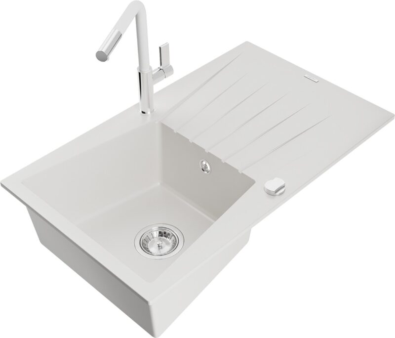 Technické dáta: drez: Rozmer: 775x470x200mm Hĺbka komory: 180 mm Rozmery komory: 410×355 mm Priemer odtoku: ø90 mm Typ: 1-miska s odkvapkávačom Typ: Zapustené do pracovnej dosky biela farba Povrchová úprava sifónu: Chrome Materiál: žula (80% žulové kamenivo, 20% živice) Prepadový otvor: Áno Otvory: (batérie, automatické) 2 Inštalácia: Univerzálna, je možné inštalovať s odkvapkávačom na ľavú alebo pravú stranu Vysoká odolnosť proti poškriabaniu a zmene farby Odolnosť proti tepelným šokom Ľahko čistiteľný povrch kuchynská batéria: Materiál: mosadz Farba: chróm/biela Hlava: Keramická Prevzdušňovač: Áno Typ: Jedna páka Rozsah výtoku: 245 mm Výška batérie: 307 mm(GT) Ean: 5905315061461