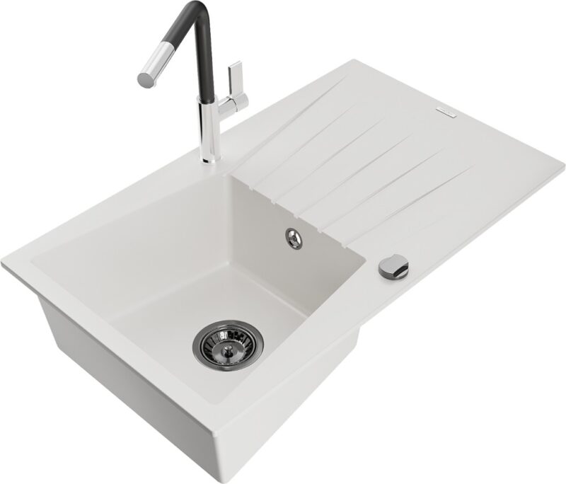 Technické dáta: drez: Rozmer: 775x470x200mm Hĺbka komory: 180 mm Rozmery komory: 410×355 mm Priemer odtoku: ø90 mm Typ: 1-miska s odkvapkávačom Typ: Zapustené do pracovnej dosky biela farba Povrchová úprava sifónu: čierna Materiál: žula (80% žulové kamenivo, 20% živice) Prepadový otvor: Áno Otvory: (batérie, automatické) 2 Inštalácia: Univerzálna, je možné inštalovať s odkvapkávačom na ľavú alebo pravú stranu Vysoká odolnosť proti poškriabaniu a zmene farby Odolnosť proti tepelným šokom Ľahko čistiteľný povrch kuchynská batéria: Materiál: mosadz Farba: chróm/čierna Hlava: Keramická Prevzdušňovač: Áno Typ: Jedna páka Rozsah výtoku: 245 mm Výška batérie: 307 mm(GT) Ean: 5905315061492