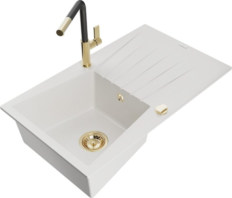 Technické dáta: drez: Rozmer: 775x470x200mm Hĺbka komory: 180 mm Rozmery komory: 410×355 mm Priemer odtoku: ø90 mm Typ: 1-miska s odkvapkávačom Typ: Zapustené do pracovnej dosky biela farba Povrchová úprava sifónu: zlatá Materiál: žula (80% žulové kamenivo, 20% živice) Prepadový otvor: Áno Otvory: (batérie, automatické) 2 Inštalácia: Univerzálna, je možné inštalovať s odkvapkávačom na ľavú alebo pravú stranu Vysoká odolnosť proti poškriabaniu a zmene farby Odolnosť proti tepelným šokom Ľahko čistiteľný povrch kuchynská batéria: Materiál: mosadz Farba: Zlatá/Čierna Hlava: Keramická Prevzdušňovač: Áno Typ: Jedna páka Rozsah výtoku: 245 mm Výška batérie: 307 mm(GT) Ean: 5905315061508